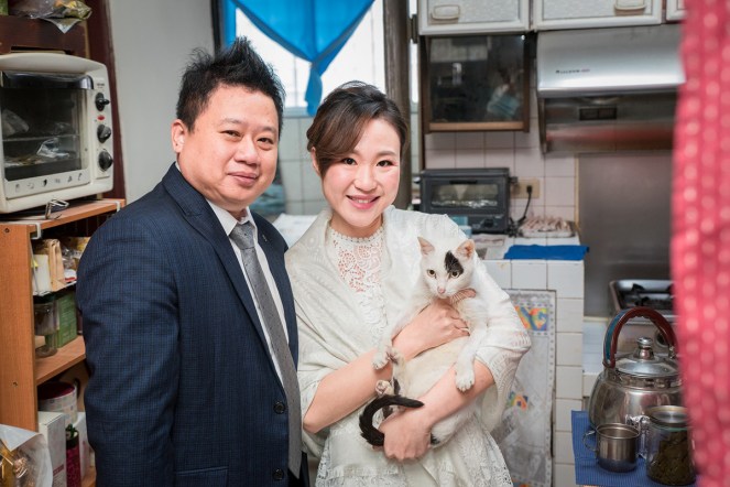 新娘書瑜是我之前玩相機時認識的底片同好,6,7年前當時去台東玩時,就聽說書瑜的母親是藝術家,當時剛好她母親有個展在美術館,這次終於有機會來到她們家,一進到她們就看到牆上掛了不少大大小小繪畫創作作品震撼到,家中還養兩隻貓星人,在訂婚儀式還偷偷在上樓梯間觀望我們。