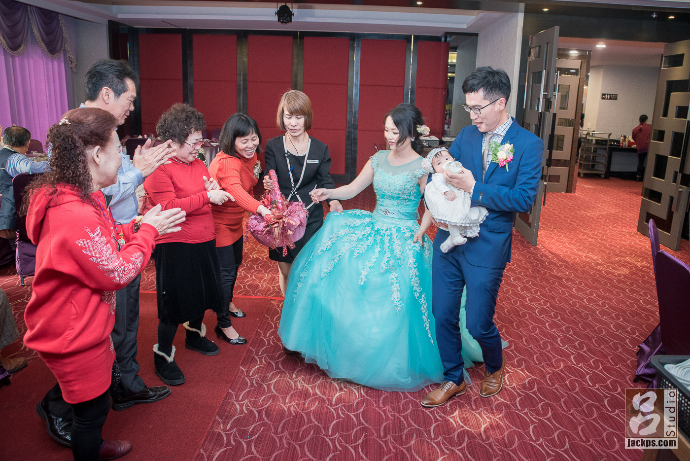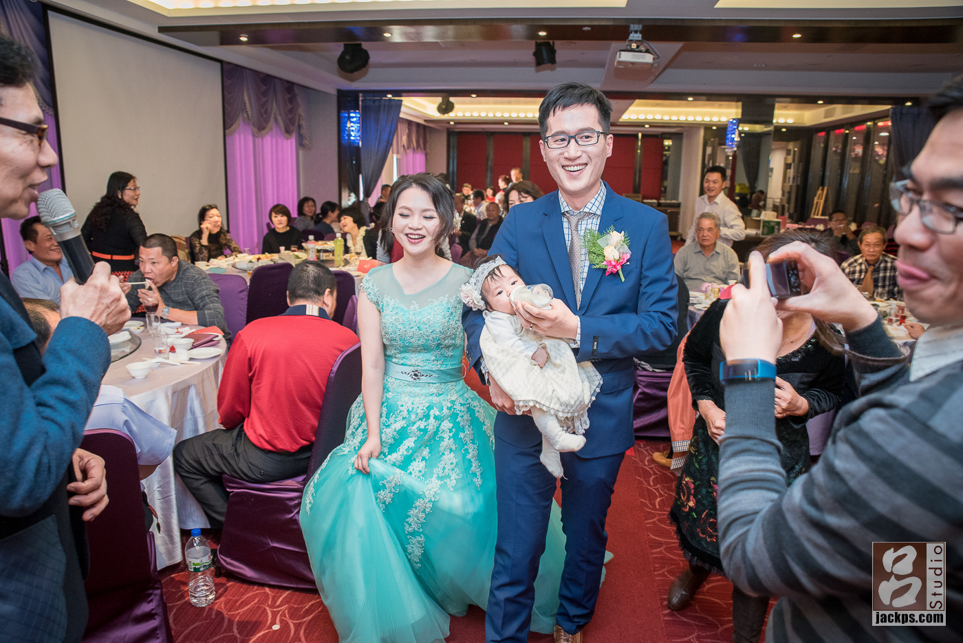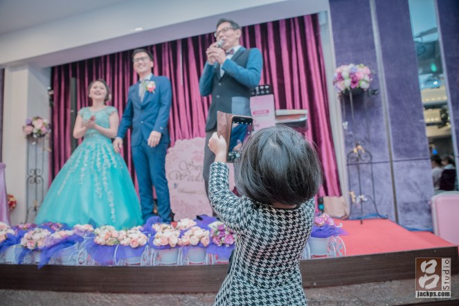 好久沒來嘉義皇品酒店,上次來這邊拍攝已是3年前,當時皇品也才開幕不到半年,這次也是在同樓層,只是我這次在另外一邊。 當時跟新郎新娘接洽時,他們是看到我拍攝 哲欣和麗嵐囍宴才查到我的。在第二次進場,新郎抱的他剛滿幾個月小孩進場,他的同事看到笑得超開心,大家都拿手機猛拍,連主桌的奶奶都笑得超Happy。