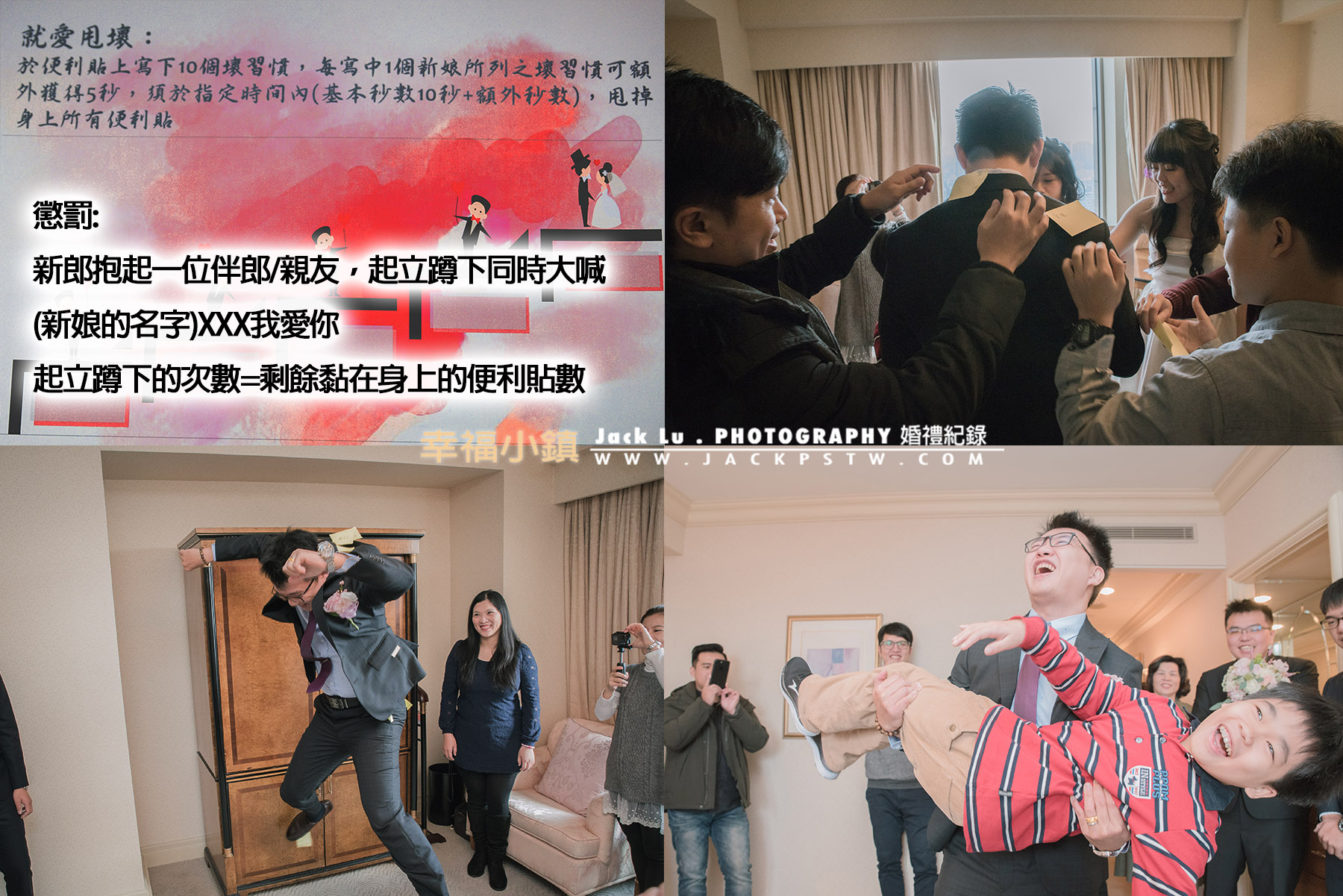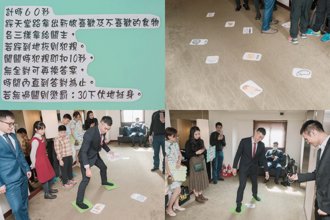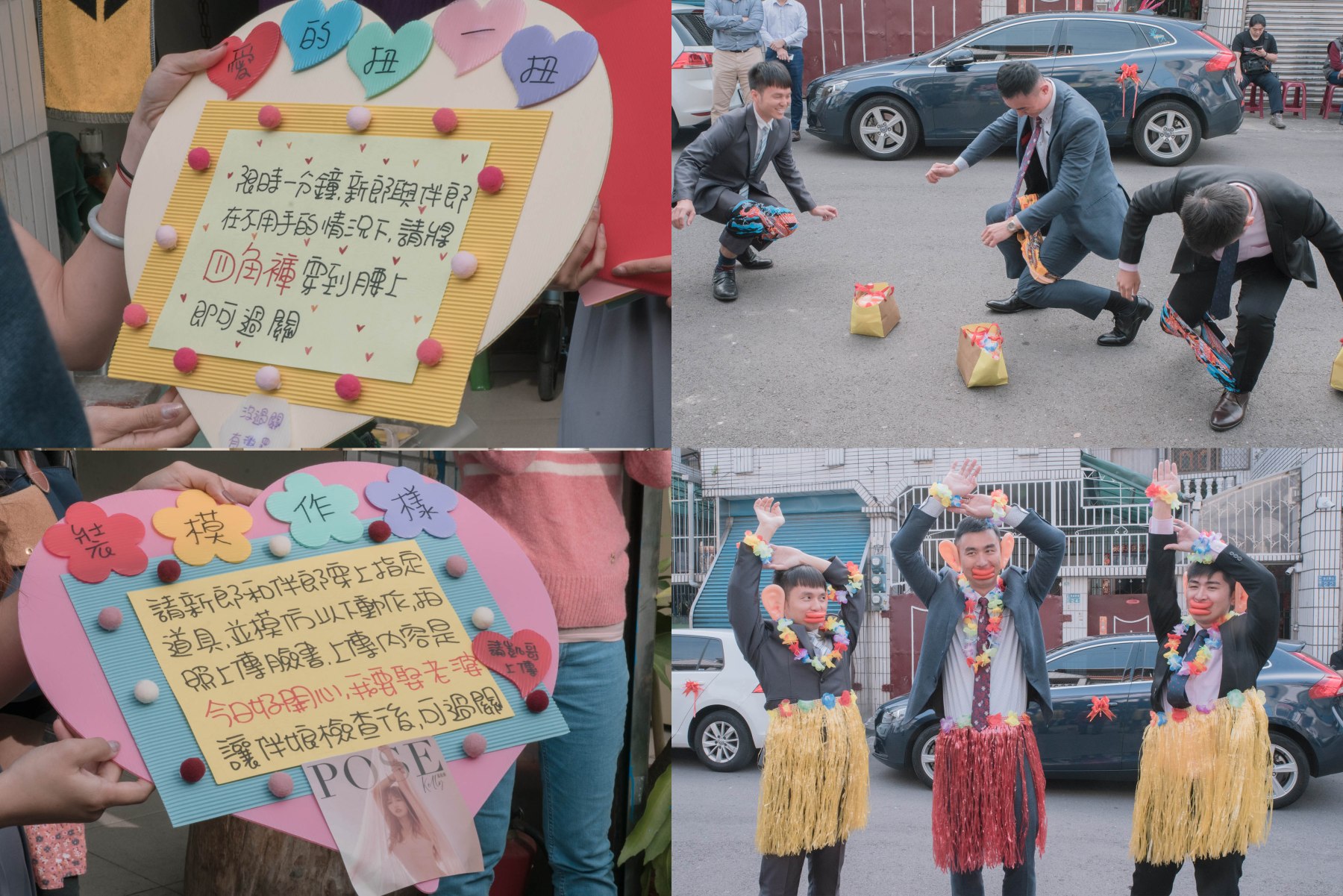 小呂個人建議通常伴娘團至少會準備三個關卡以上,畢竟不能讓新郎倌覺得新娘是這麼簡單就可娶回家的,不過新郎也不必太緊張,通常新娘也是會心疼新郎的,這個目的主要還是要營造個輕鬆娛樂的效果或在等待迎娶時辰,這也可讓婚禮攝影師拍攝到一些你們與伴郎朋友趣味畫面,在這邊也是建議親友團娛樂效果有做到就好,最後還請注意,時間要抓一下,不要因為時辰關係讓新郎藉機跳關了。