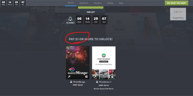 PhotoMirage官網售價是 60 USD,他本身有提供15天免費試用期,但是我會建議你直接用我給的LINK購買。因為現在透過這個第三方網站Humble bundle上面購買只需要1美金。這個是限時優惠,要注意時間。