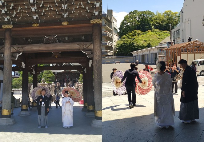 前陣子剛好去日本玩,其中一天來到了成田山新勝寺,正好遇到正在拍傳統和服新郎新娘,後來我查下日本的花嫁和服,有分成4種白無垢、色打掛、引振袖和振袖,我拍到這幾張是新娘穿的應該是白無垢。
