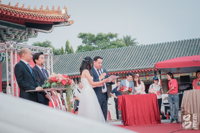 今年第二次高市市民聯合婚禮是辦在10/12號的孔廟,這場將是今年市政府辦的最後一場聯合婚禮,這場不像第一場有上百名新人,有一些是第一場沒排到,變成第二場,這場的時間地點天氣都比較舒適,這場主辦提供位子給每對佳偶,不像第一場大家都全場站的證婚,時間是辦在10月中,天氣也比較涼爽,大多數會前來觀禮的都是新人他們的親友居多,人潮就不像第一場有上百對新人,地點辦在孔廟,剛好是高雄左營萬年季,外面有很多攤販,結束後親友們還可進去夜市繞下。