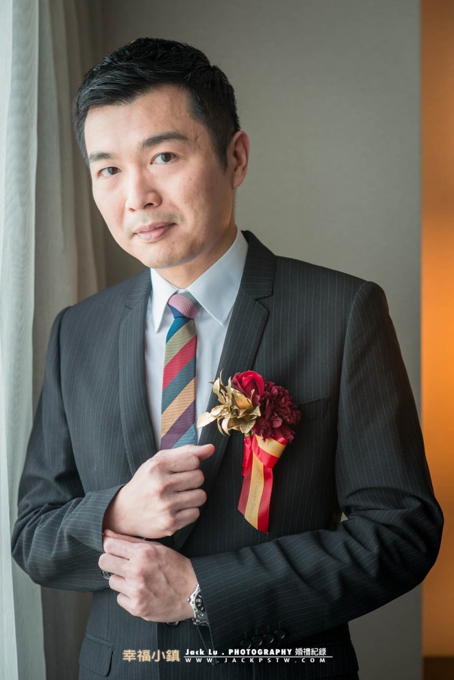 喜宴當天新郎通常都會穿西裝,正規的西裝上面都會有領子,正常是把胸花別在左胸領口上,或者左胸靠近心臟附近,但請不要放在口袋裡面喔,以西服禮儀而言,口袋是拿來放「方巾」,不是放胸花的。另外有些西裝領口的鈕扣上方,會有一個小口,這個就是用來扣住胸花,避免花梗露出,但是有些西裝這個小口特別高,或你的花束太大,別在那會讓整體視覺看起來怪怪的,所以店家都會提供別針,讓你也能直接用別針固定,花梗露出是沒關係,那才是新郎胸花的正確位置。