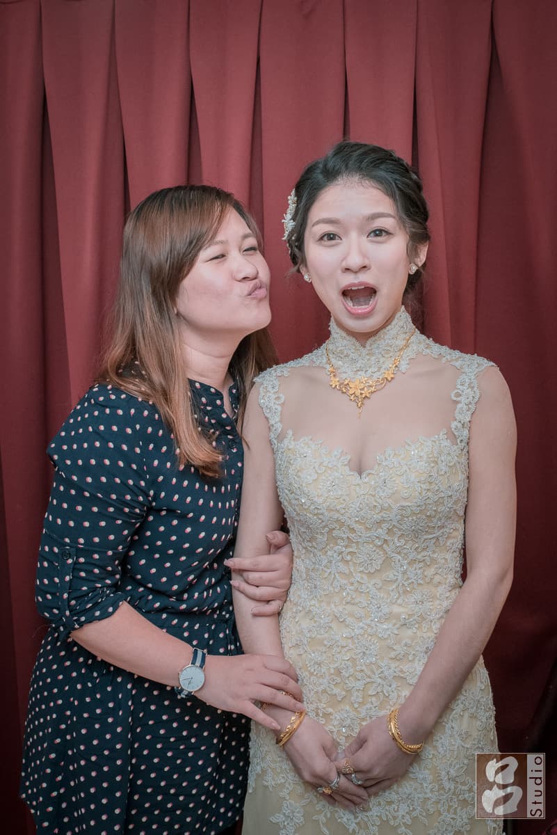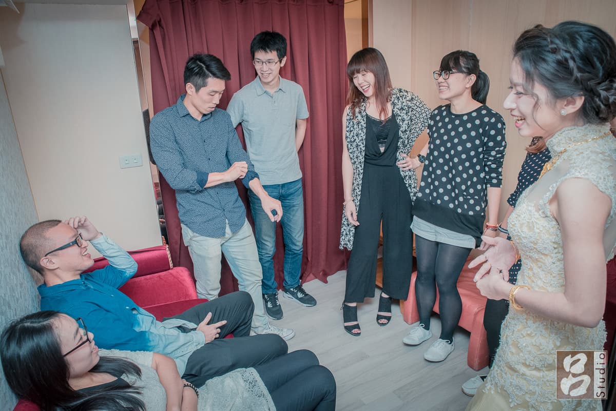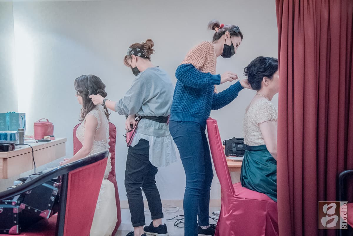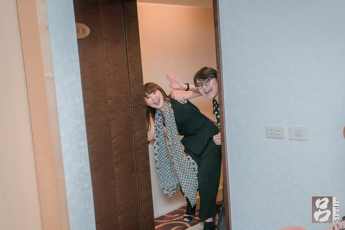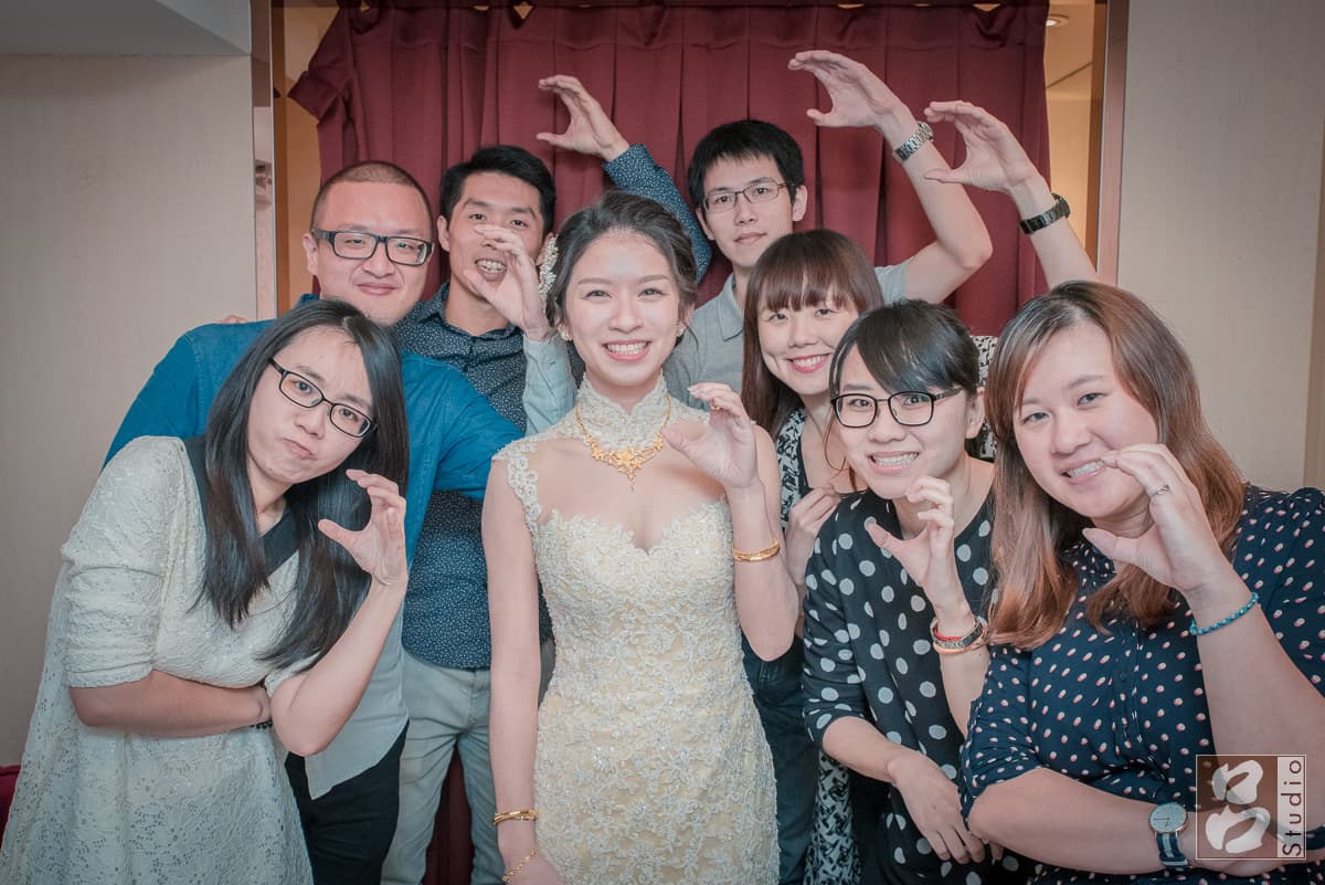 這次新郎新娘看起來都很年輕,男才女貌,在準備做造型時,衍婷的好姊妹前來探房,好姊妹們看到衍婷化妝後的樣子,簡直完全不同人,有點嚇到,新娘的同事相當有趣,也配合演出,替照片加分不少。