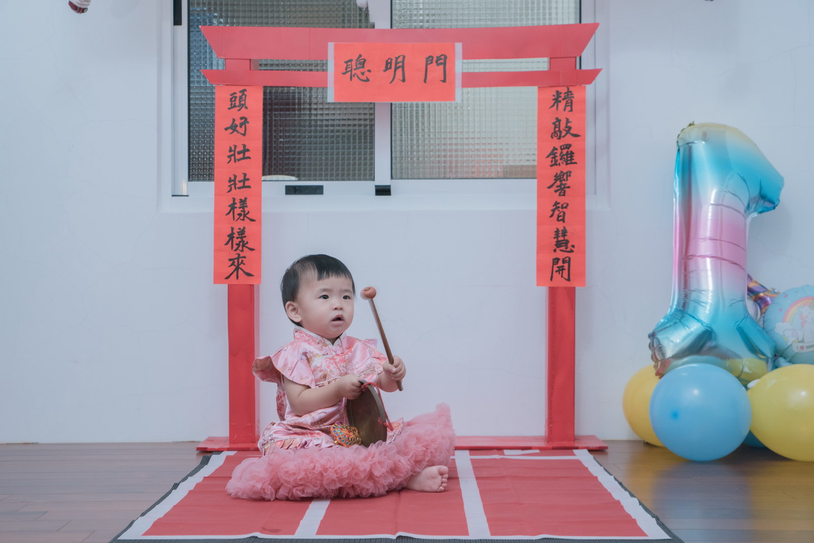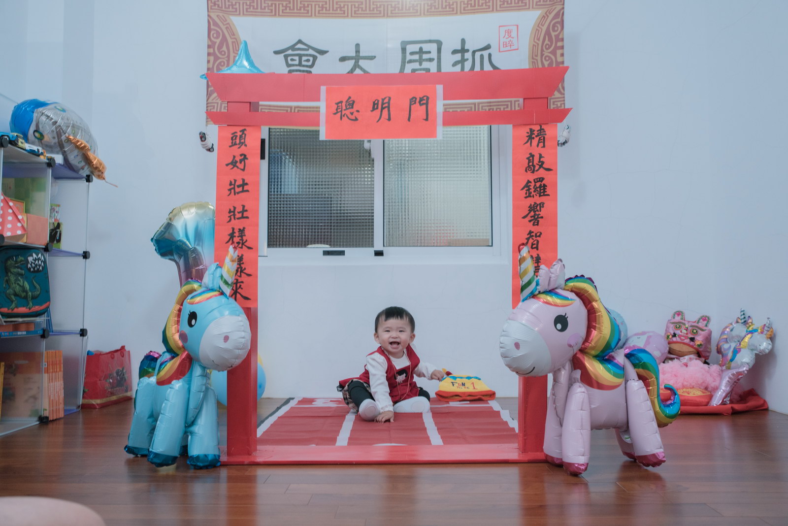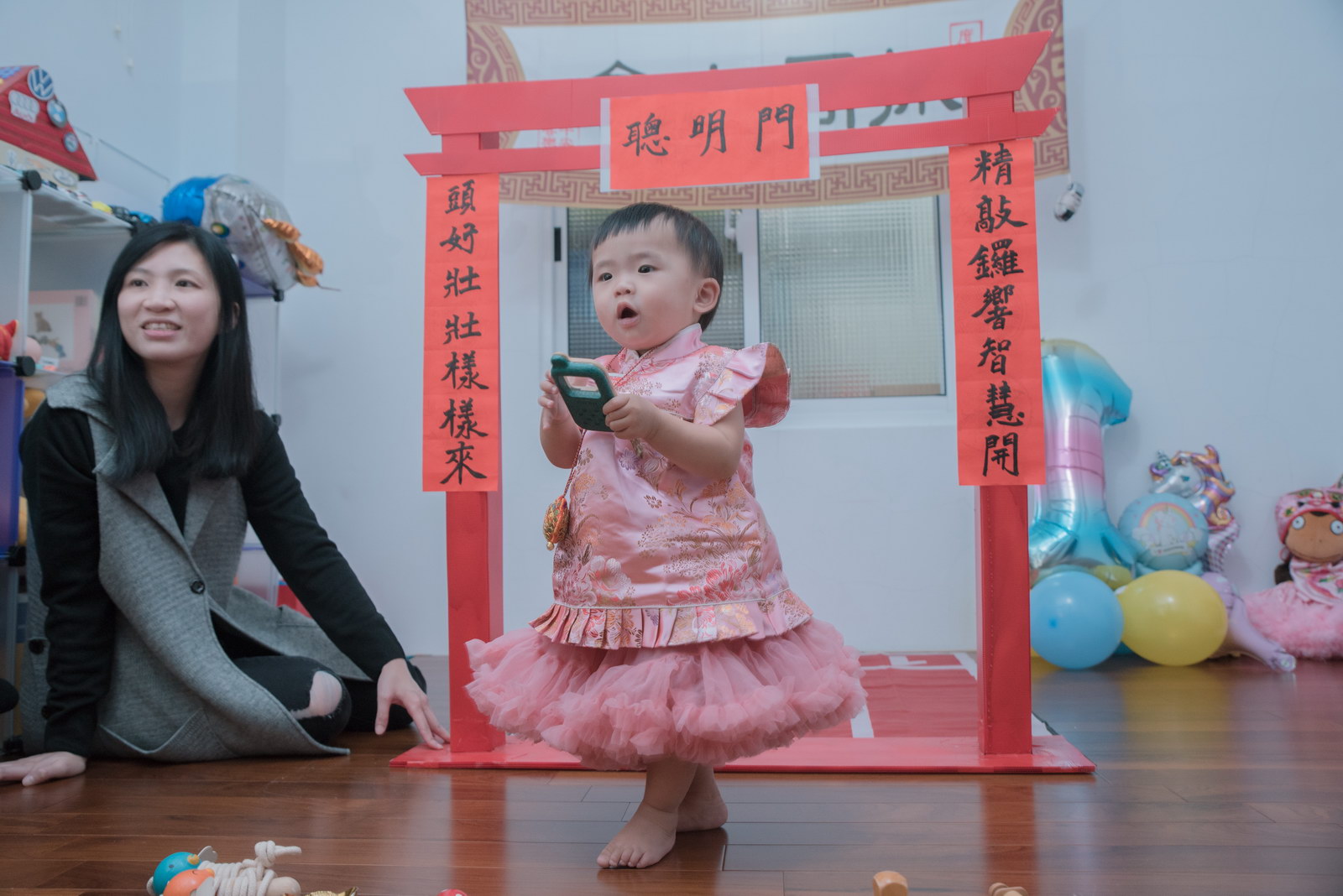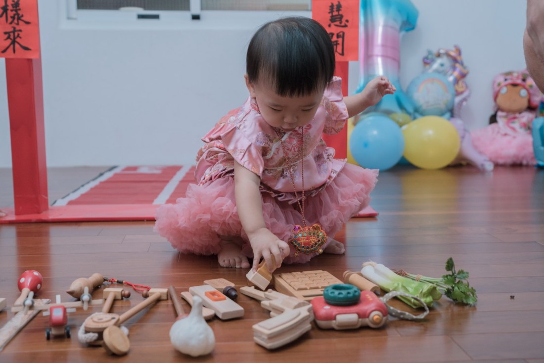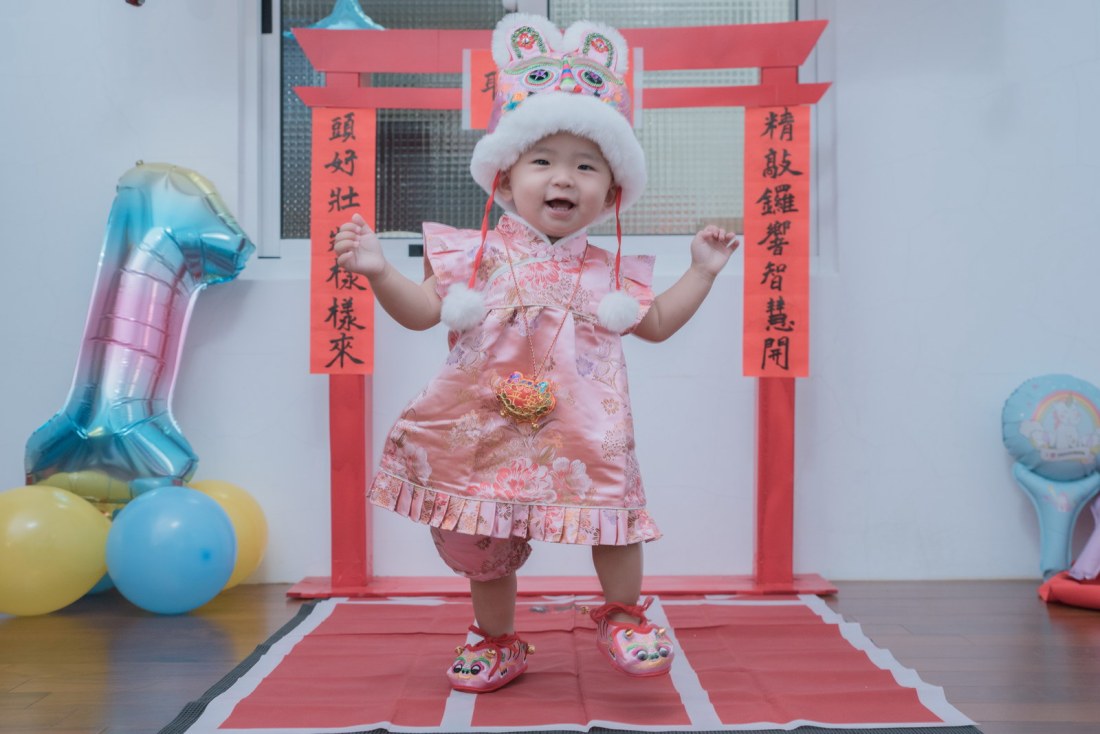 這次小朋友萱萱的爸媽,為了替妹妹慶生,設計了一個別出心裁的生日宴會,自已DIY做了一個聰明門,媽媽特別準備三套為了這次拍攝。原本是計劃在12月初就拍攝,因小孩一直微微發燒,超過一週才特別去醫院,醫生建議留院,才導致延後到一月初聽奶奶說爸媽為了這天拍攝前晚整理到很晚,都沒甚睡,早上拍攝完抓周,下午還特別花點時間出來外面拍攝一些與小孩互動、陪伴小朋友畫面,這次奶奶也是辛苦全程配伴,一次顧兩小。