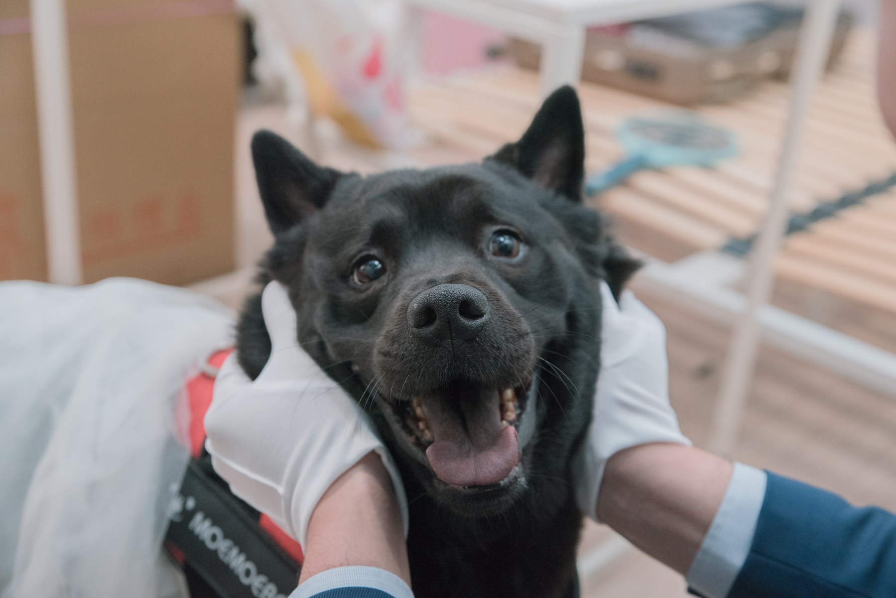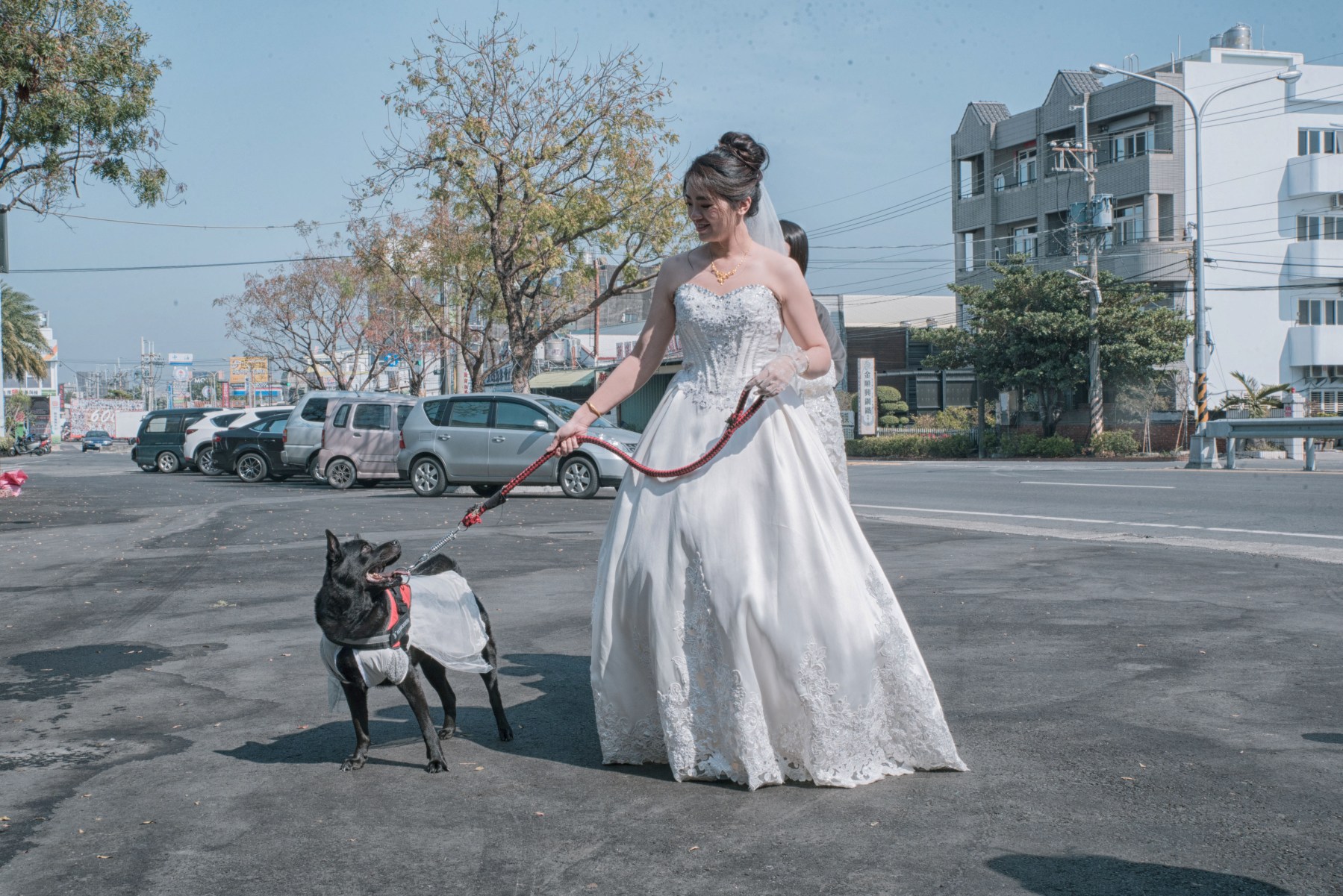當時在跟他們溝通時,新郎就在考慮是否帶毛小孩一起去會場,不想讓她獨自留在家中,當天到LuLu到婚禮會場,原本打算讓她一起走紅地場進場,還特別把她專屬推車載過來,只是看lulu看到現場一堆新奇東西人又多,變超興奮,一直想衝進去喜宴會場,當天顧他親友也超辛苦,一直抓到繩子很怕她暴衝或想亂跑,早上新娘在幫lulu穿白紗時,我拍到lulu的眼神,感覺知道今天很特別像是要發生什事般,我聽他們家人早上帶她出去散步尿尿都沒尿。我再傳照片給新娘時,說他們家的毛小孩LuLu照片特別的多,新娘說lulu今天也是算是第二個伴娘