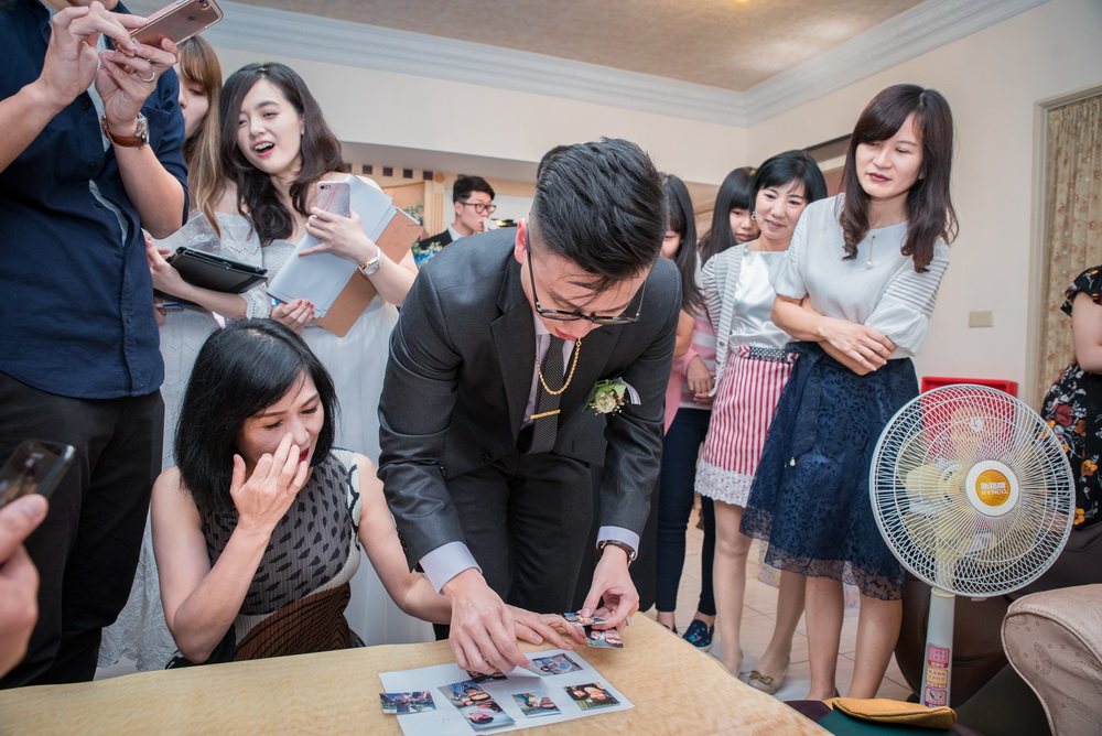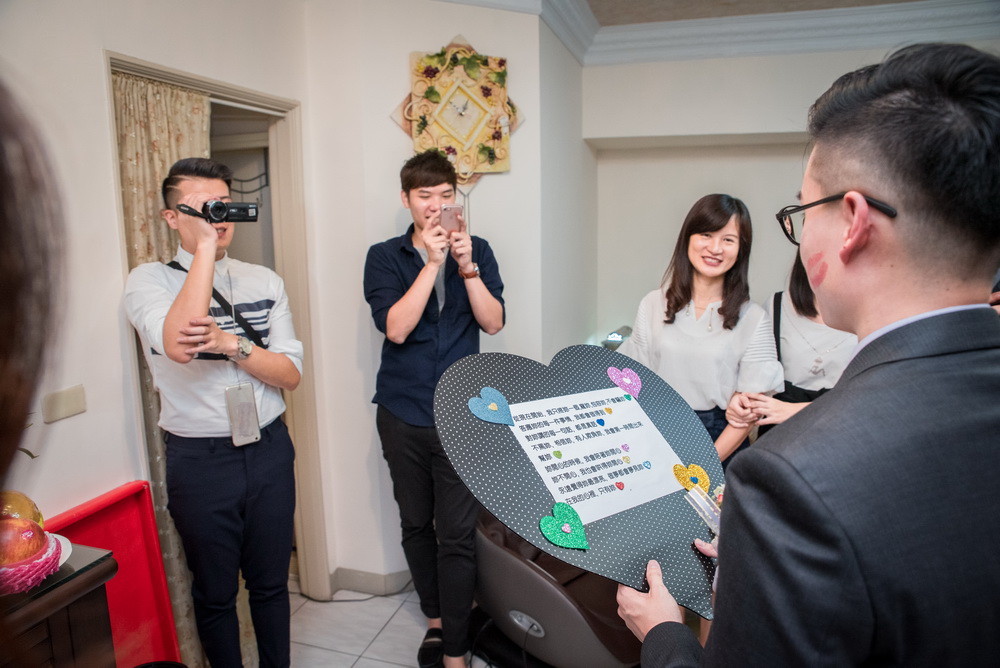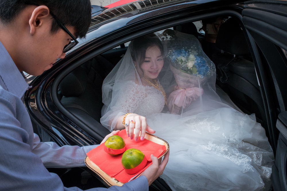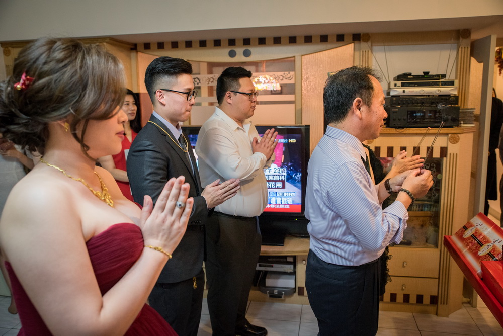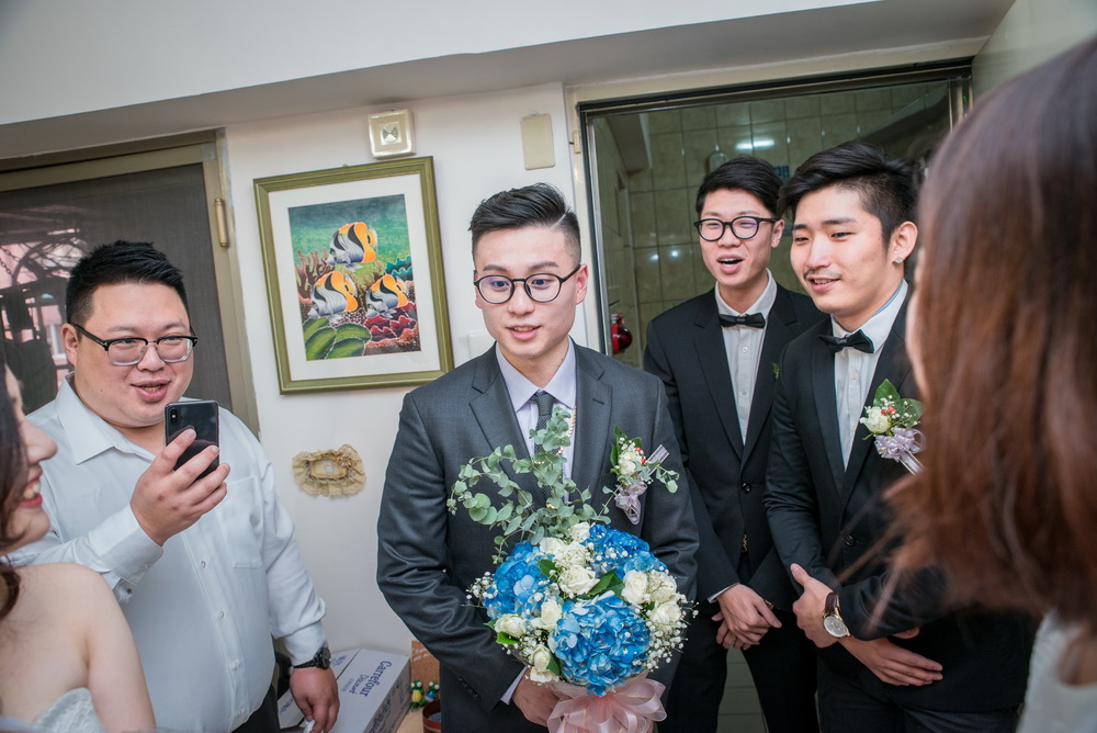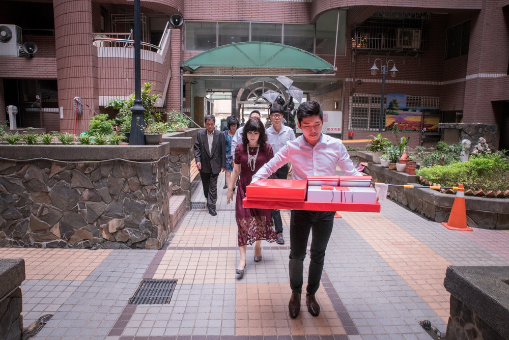 早上在進行這場訂婚儀式時,女方親友來了超多人,還好新娘家的客廳夠大,新郎本身是北部人,當天早上也在新娘家化妝,儀式快開始時,直接下樓與車隊會合,在外面繞一圈,進行當天訂婚流程,相當的流暢,進行交換戒子時,可看到新郎新娘他們2位都很調皮,故意灣手指不讓對方容易帶進去,看的出來他們2人平時互動相當好,如果有注意看照片,可看到新娘的媽媽在擦拭眼淚的畫面,想到自已寶貝女兒嫁出去,下午的迎娶場,就更感人。