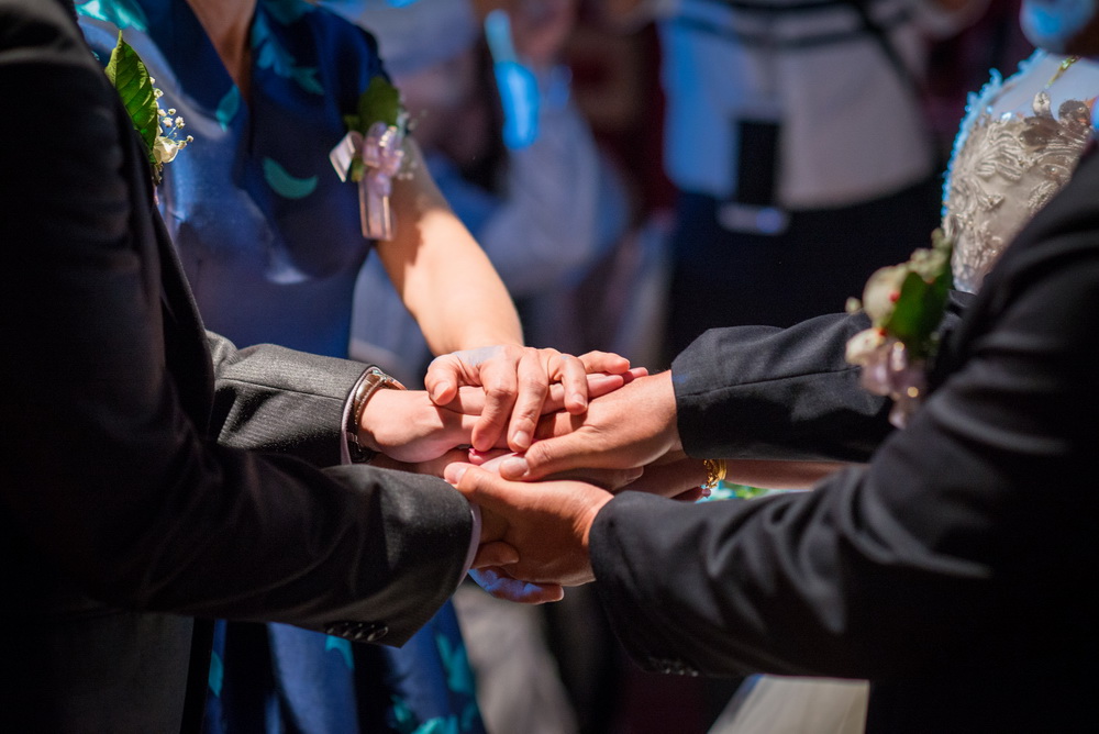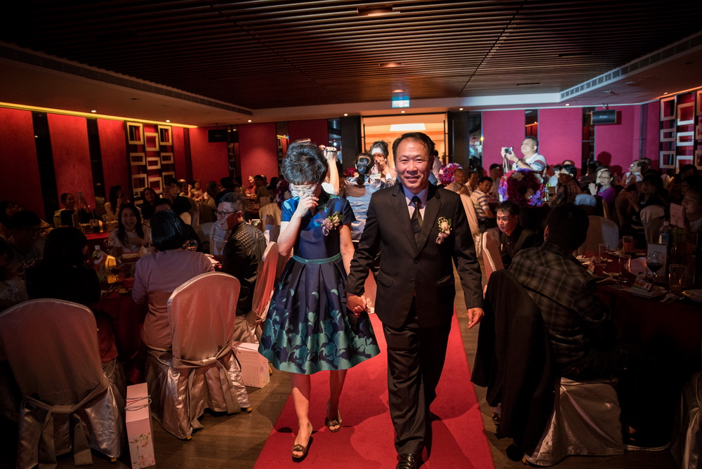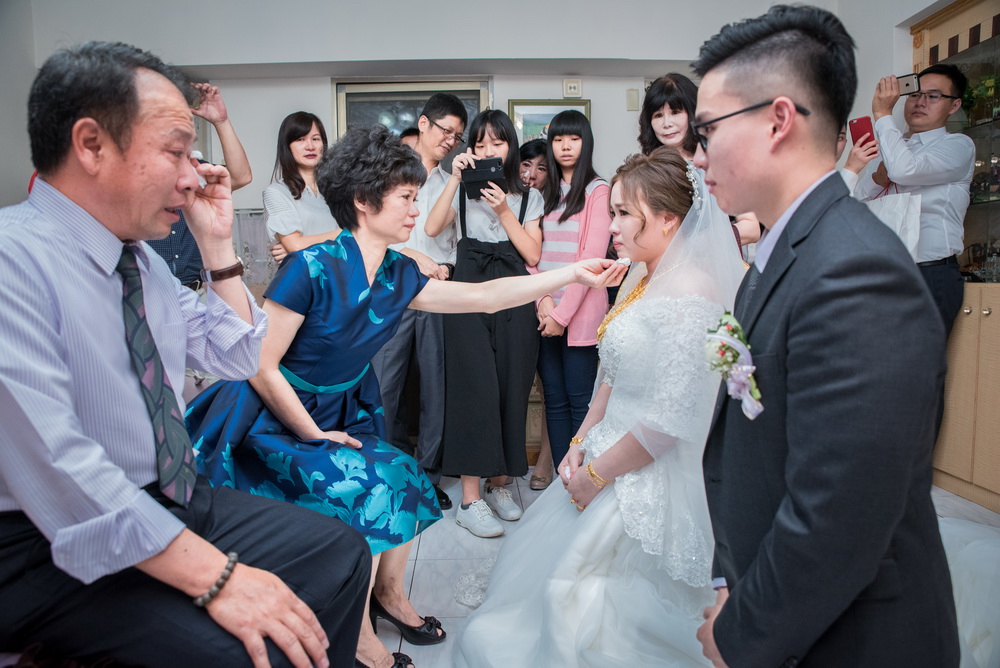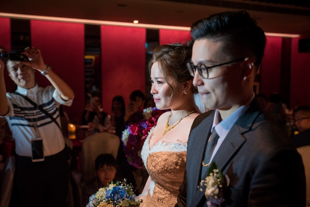 進行新娘迎娶時候,當新郎走進新娘房跪下獻上捧花時,新娘就忍不住掉淚起來,新郎看到這幕也忍不住掉淚,出去外面進行拜別時當新郎新娘都跪下時,媽媽已開始掉眼淚,女兒看到媽媽的不捨,也開始哭了起來,接的一個一個都掉起淚來,除了主事人掉淚,在旁的觀禮親友也被當時氛圍感動到。
