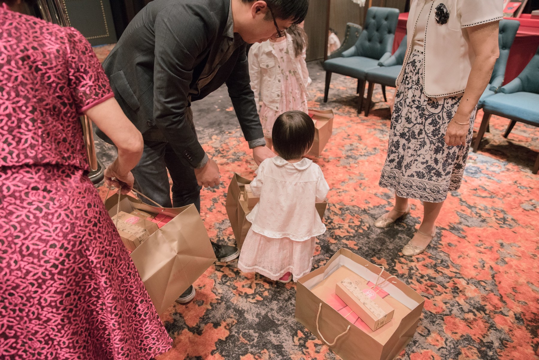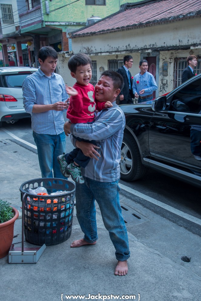 小大人,看到照片中小朋友,各位覺得像不像兩位很久不見的好友在喜宴會場遇到,勾肩搭背,穿紅藍條小朋友,一手拿的今天的喜宴打包的東西,另一手勾的老友,就像老大人一般,當我第一眼看到就像Deja Vu 似曾相識,在之前某的場景看過這樣畫面,在門口觀察賓客的我,馬上拍下他們2位。 相當可愛,我在想小朋友應該是模仿爸爸樣子,爸爸應該也做過這樣動作,不知不覺他也做出類是動作。