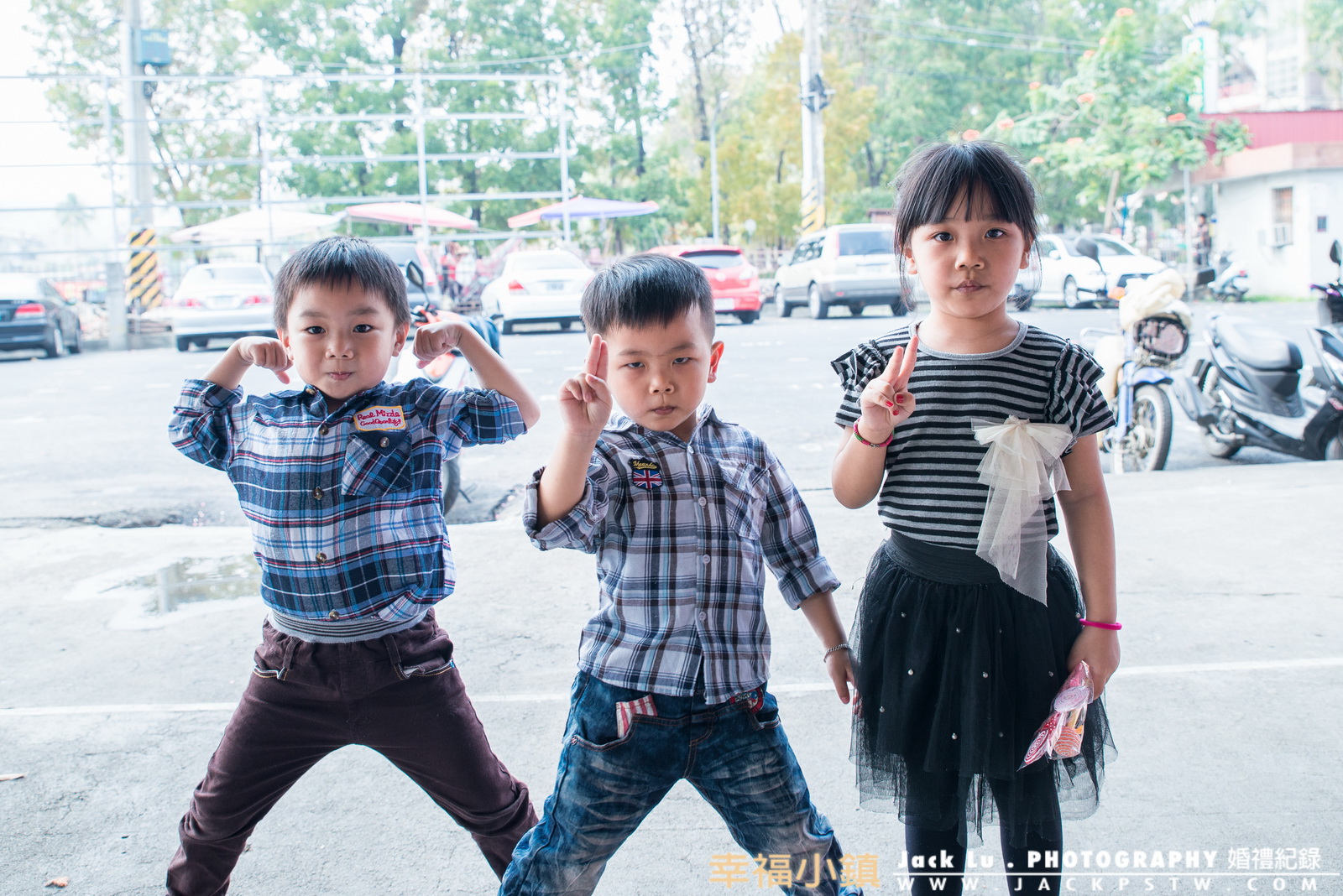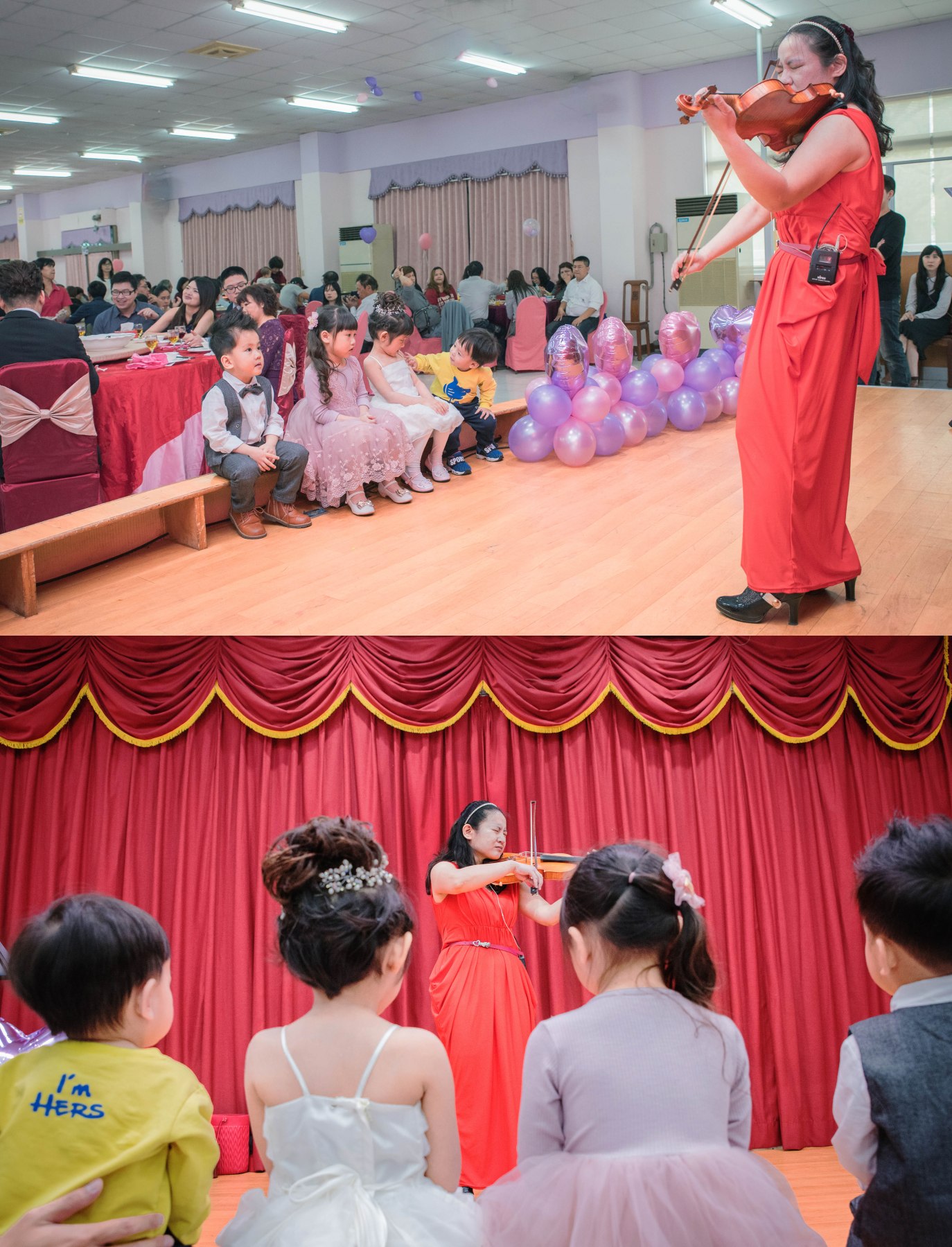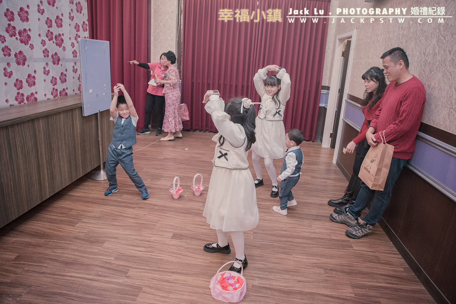 新娘正在婚宴場外準備進場,我趁空檔拍攝幾張類婚紗照,拍攝完剛好看到小朋友們在旁邊