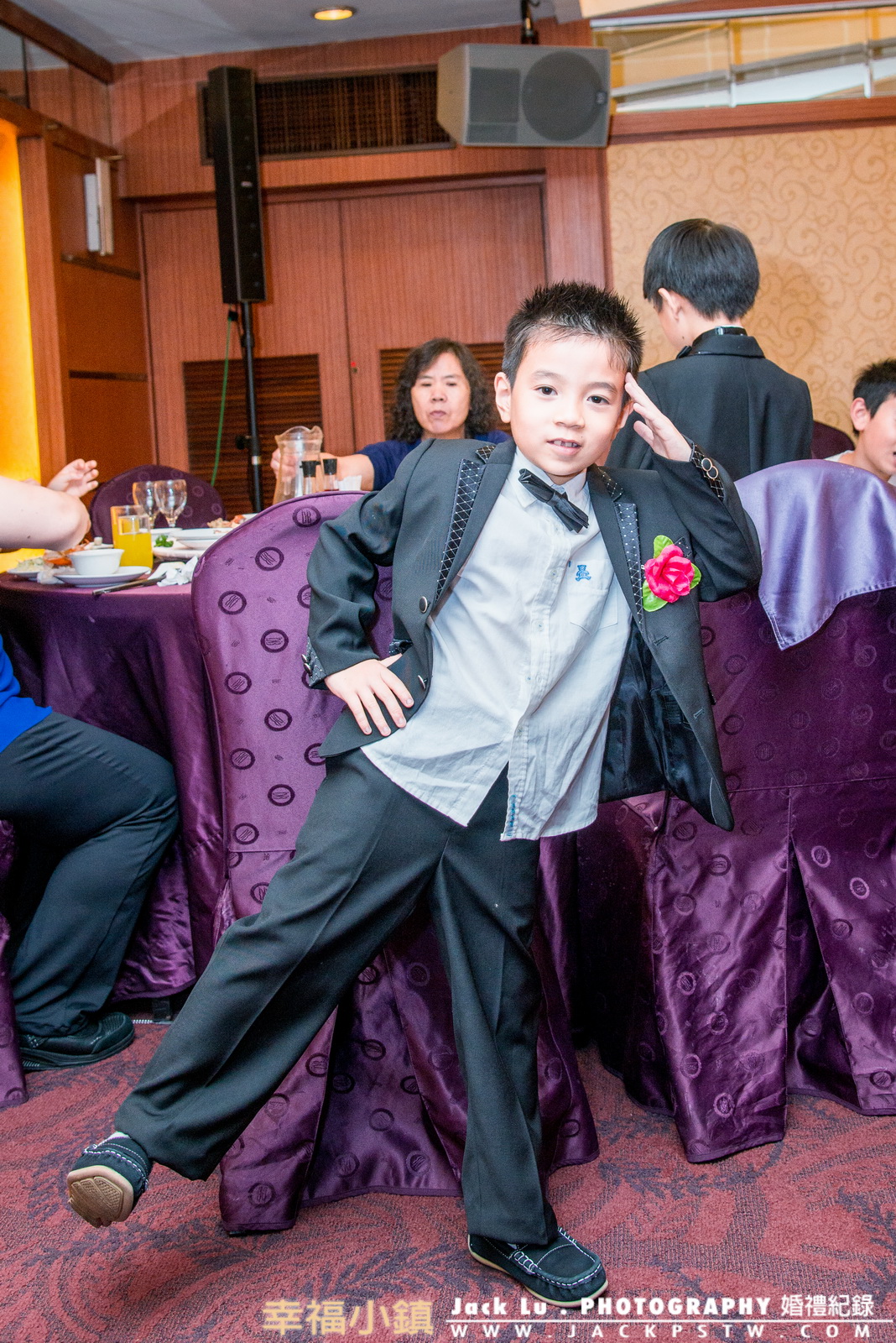 花童盛裝打扮穿上特別訂製的小西裝,很高興的在喜宴場內玩耍,爸爸一直叫小朋友不要玩皮,這樣會流汗把西裝弄髒,但是小朋友忍不住興奮心情,一直跳舞,做動作 給我看。