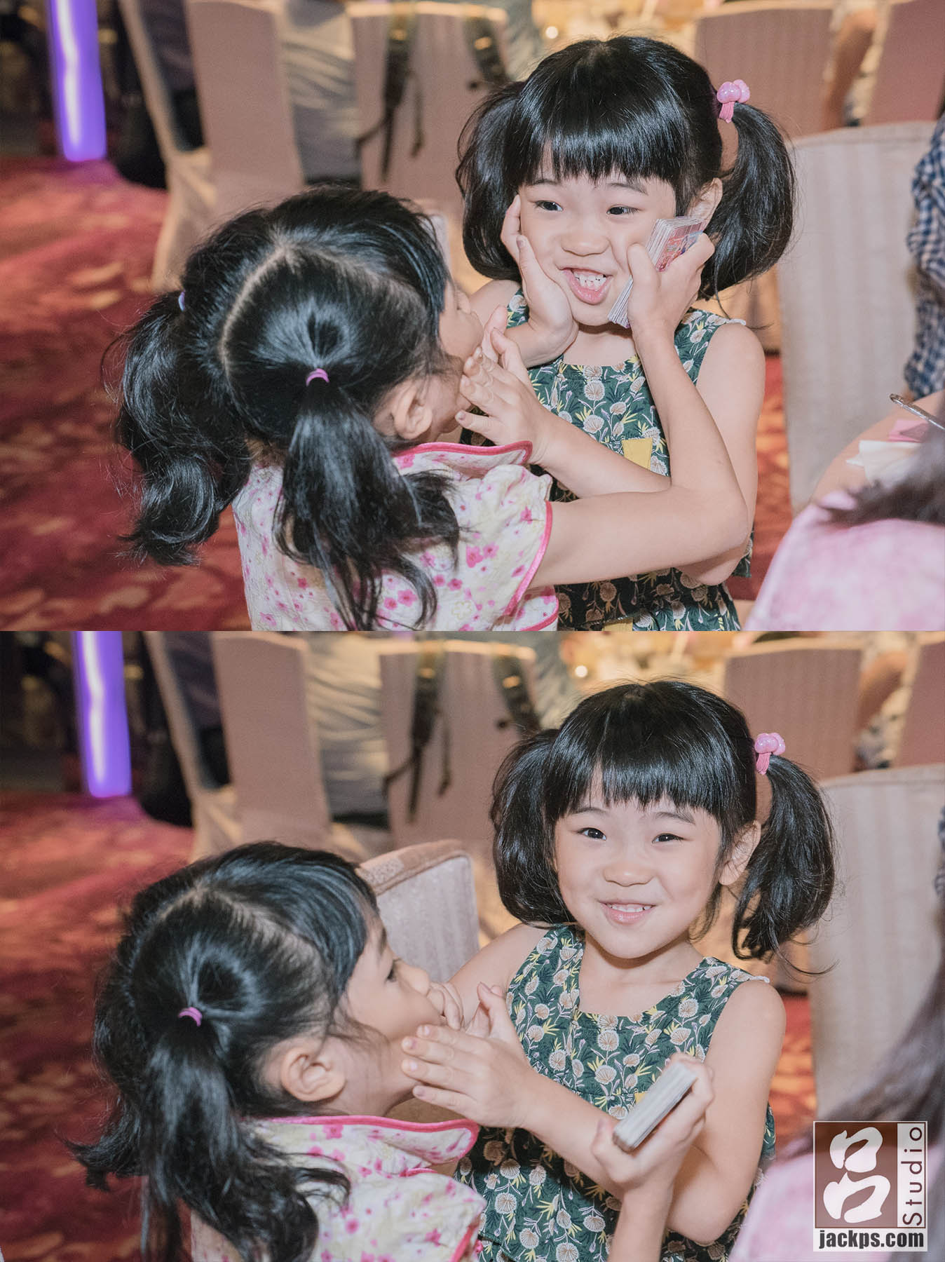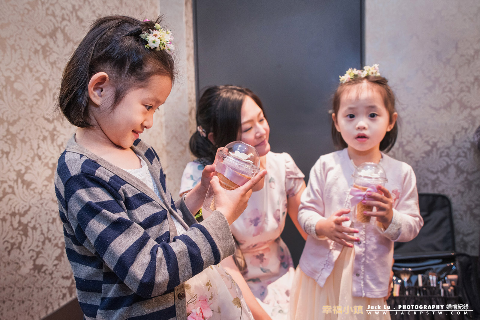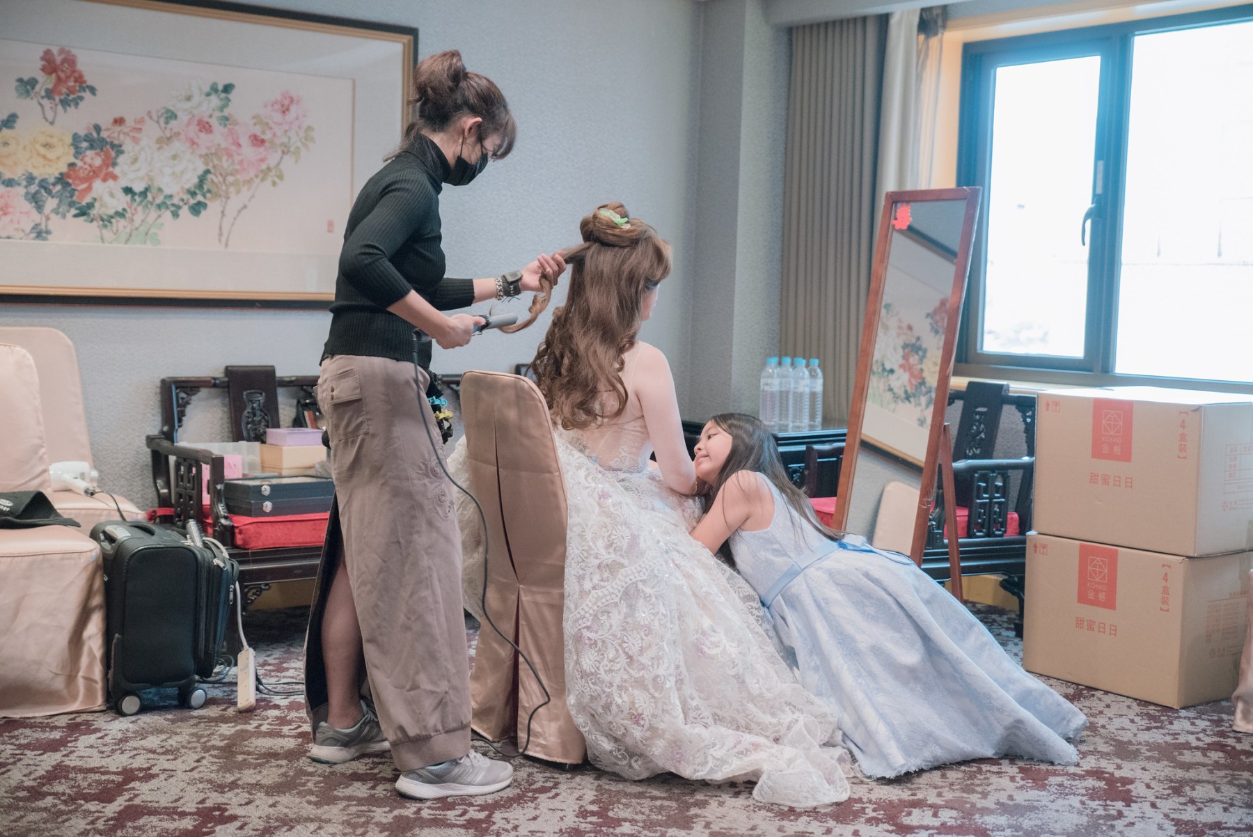 小朋友在新娘休息室玩了,起來小姐姐跟旁邊妹妹說這個攝影師是壞人,一直在拍照
