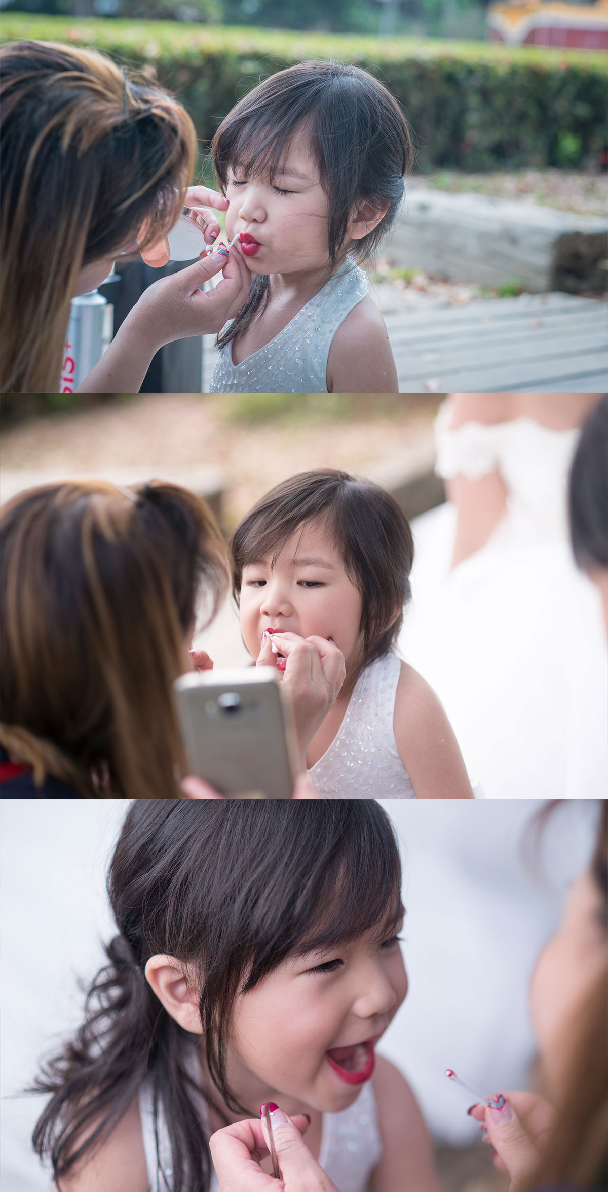 這次新娘外甥女超愛穿美美拍照,第一次穿上禮服超開心,新密老師請妹妹嘴張開塗口紅,邊化妝同時旁邊媽媽用手機拍照給她,小妹妹看到自已化妝出現在手機上,原本O型嘴,慢慢的變成笑起嘴型。新密看到這段也笑出來。