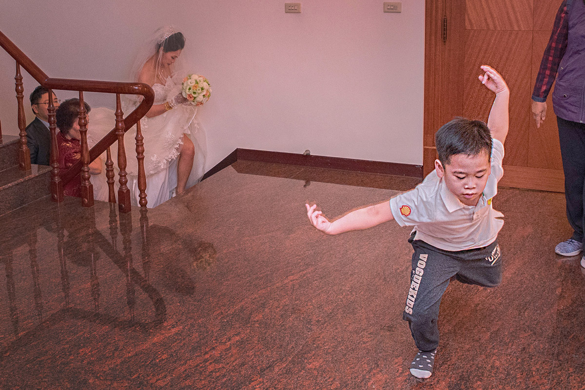 新郎家中的小朋友,看到新娘上樓要進新房, 弟弟馬上跳起,使出大鵬長翅,以飛躍招式移動,剛好被我在等待新娘同時拍下 他的動作,他這個動作相當的快,可能不到一秒,我能拍到這張小朋友與新郎新娘在同個畫面也是巧合中的巧合。