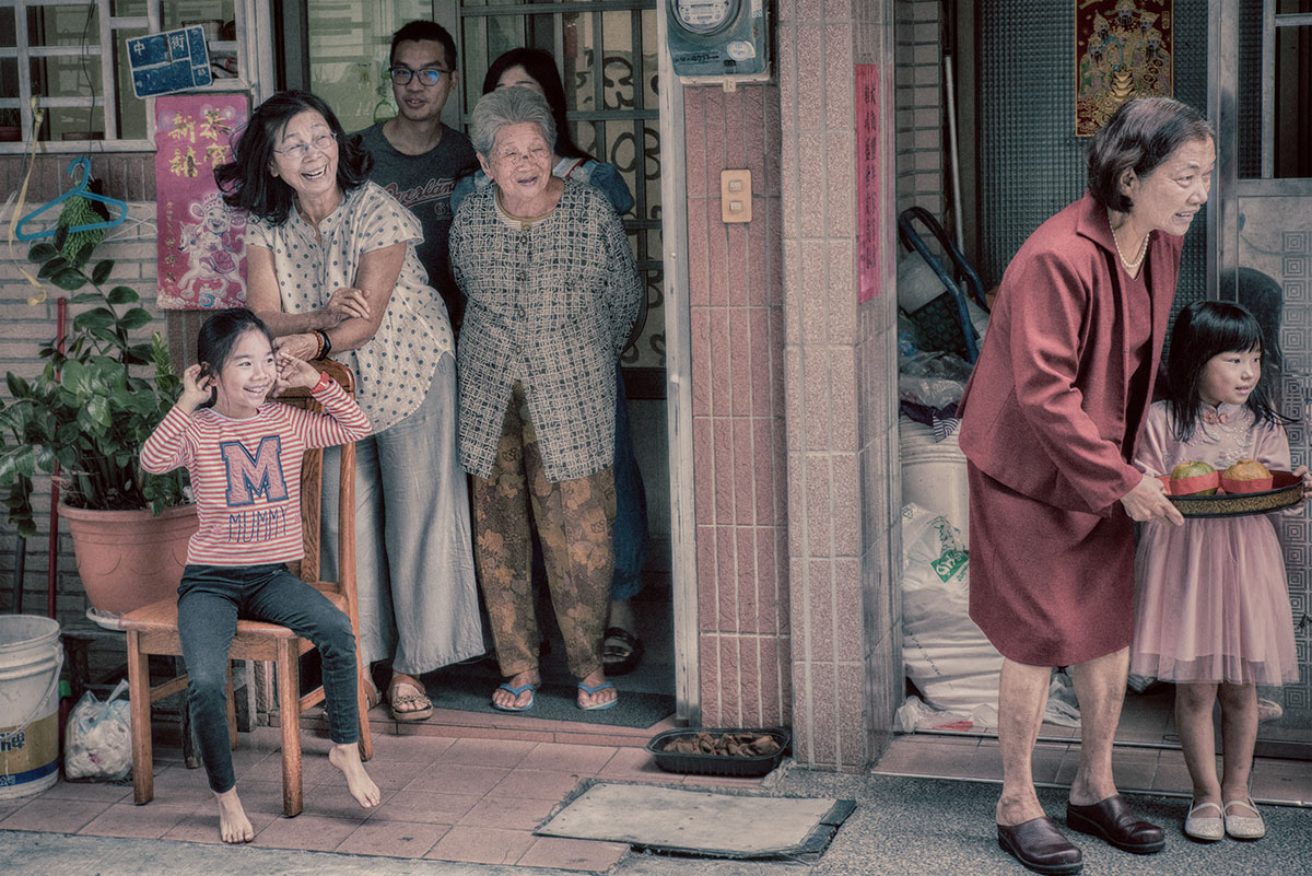 等待新娘車隊開進來,已旁等待好命婆與捧橘子的晚輩,隔壁的鄰居也觀禮湊熱鬧,鄰居的妹妹還特別從家中搬椅子出來坐,嗚好耳朵等待放鞭炮,老神在在,很期待看到白紗的新娘子。