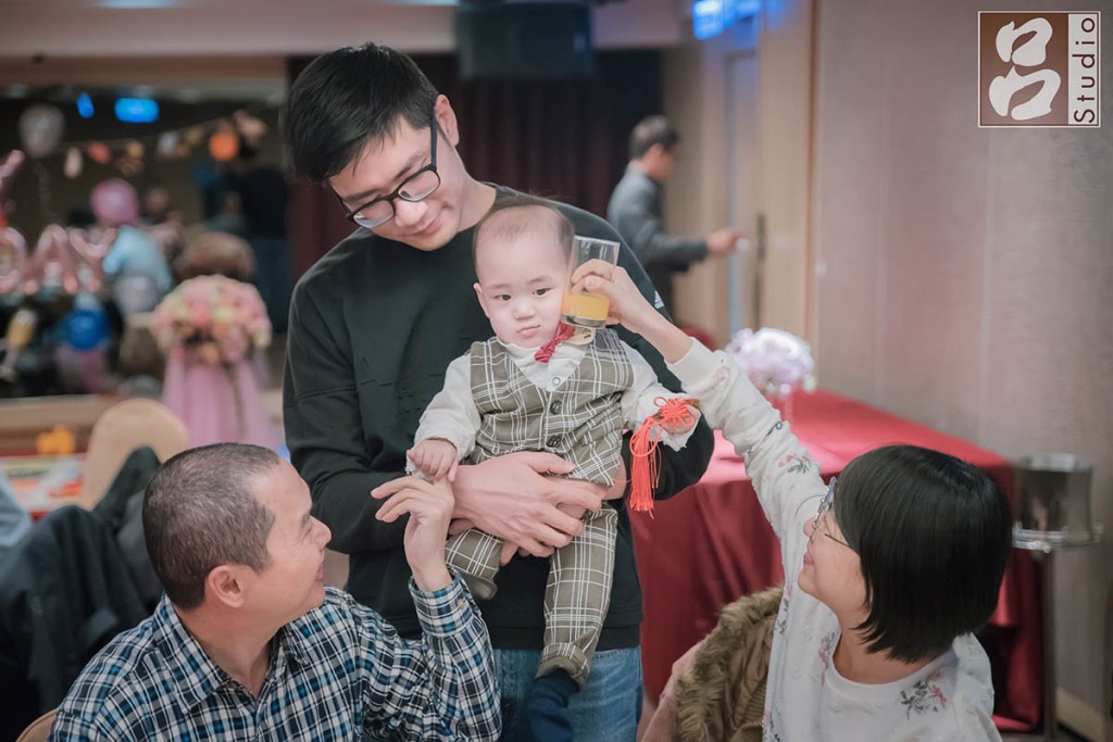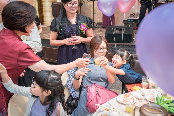 在喜筵進行到後半段,新郎新娘在逐桌敬酒時,小朋友看到大家拿的杯子很有趣敬酒,也拿起來想跟阿罵作敲敲杯動作,小妹妹第一次體驗到敲敲杯笑得超開心。