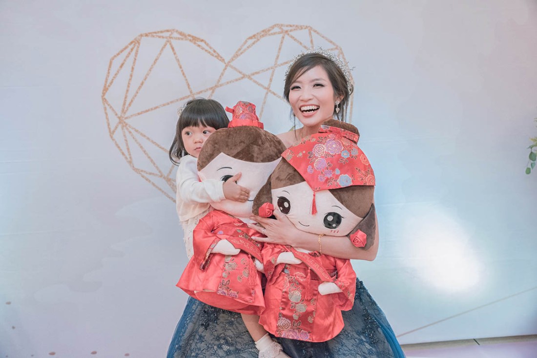 想說都沒拍到,就請新娘拿起來拍照,拍到最後小妹妹也加入變成新娘子一次抱三個,