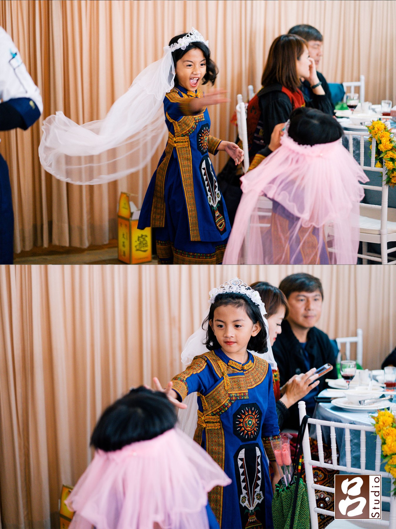 2位穿的原住民的花童在現場玩起來,頭上頭紗是新娘特別為她們準備,當我發現在她們2位發現喜宴會場太無聊,就跟妹妹玩起來,姊姊使出鋼鐵人的招式