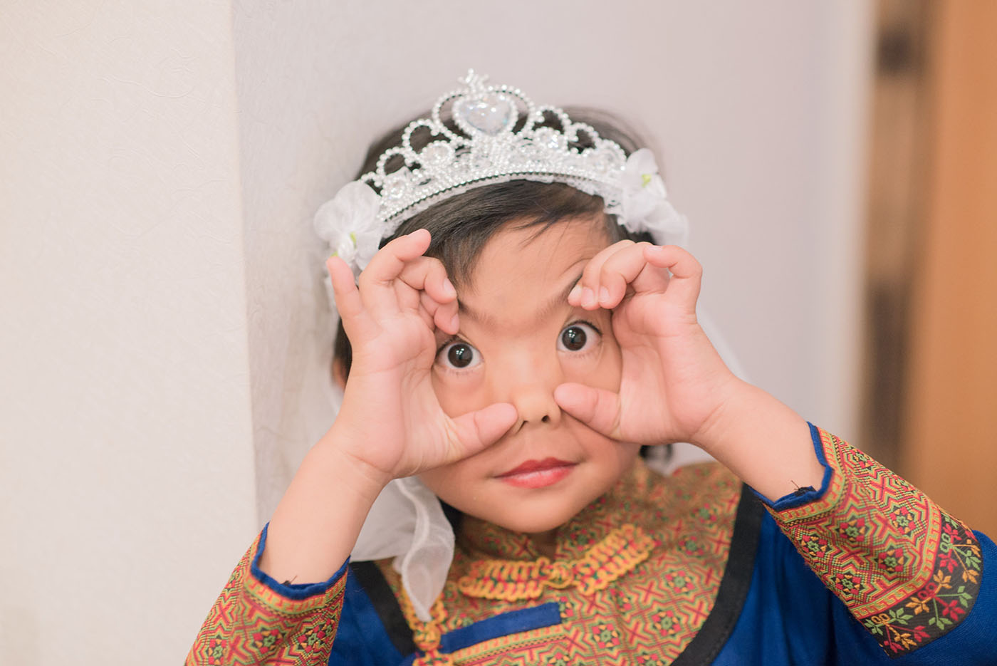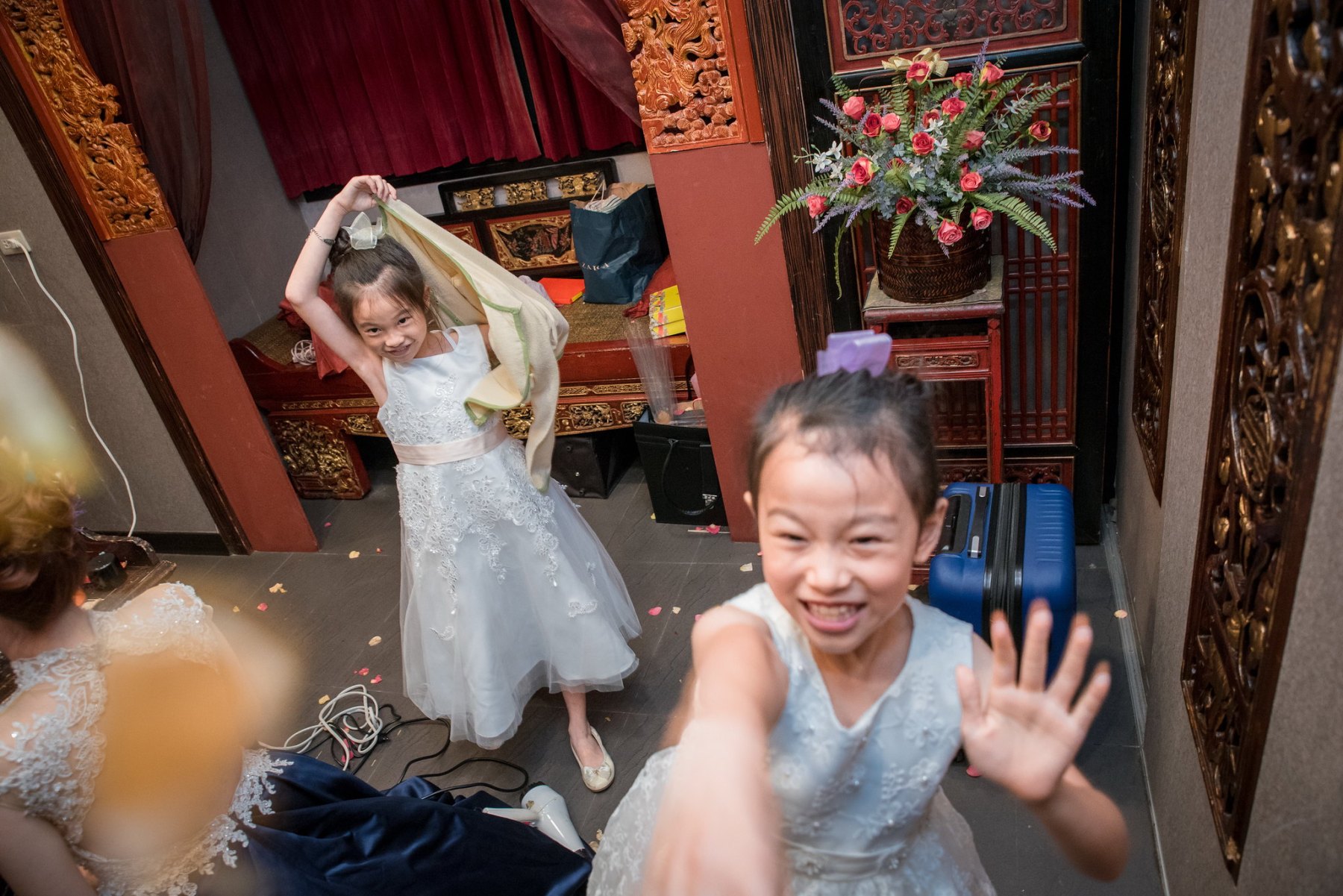 新娘休息室內可愛的賓客,媽媽特別當她準備家鄉傳統衣服當作婚禮花童,當時他跟另外小朋友在玩耍,看到相機對她們害羞起來,我就跟他們玩起來,我請他們做出Batman眼罩的樣式,小朋友也很配合,拍下這樣畫面