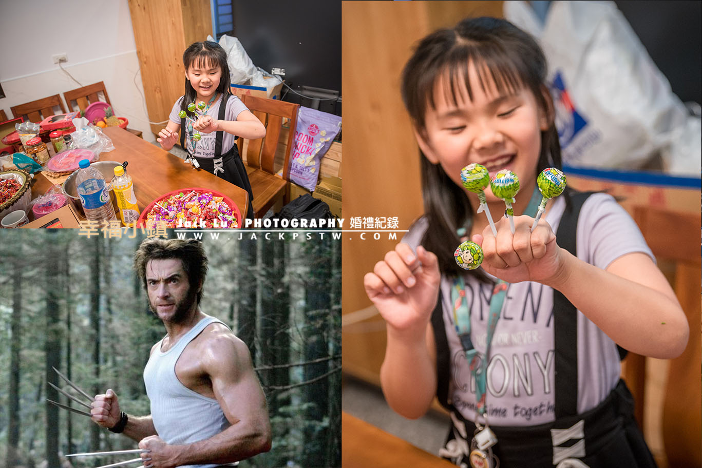 小朋友等在吃飯時,無聊發慌時,自已坐在那邊看得喜糖,那邊摸得摸得,當我看到她把一根棒棒糖拿出來插在手上,接得又拿了一根,讓我靈機一動,想到金鋼狼的手上的爪子,我就請她拿棒棒糖插滿手,小妹妹很開心露出表情,拍下這樣畫面