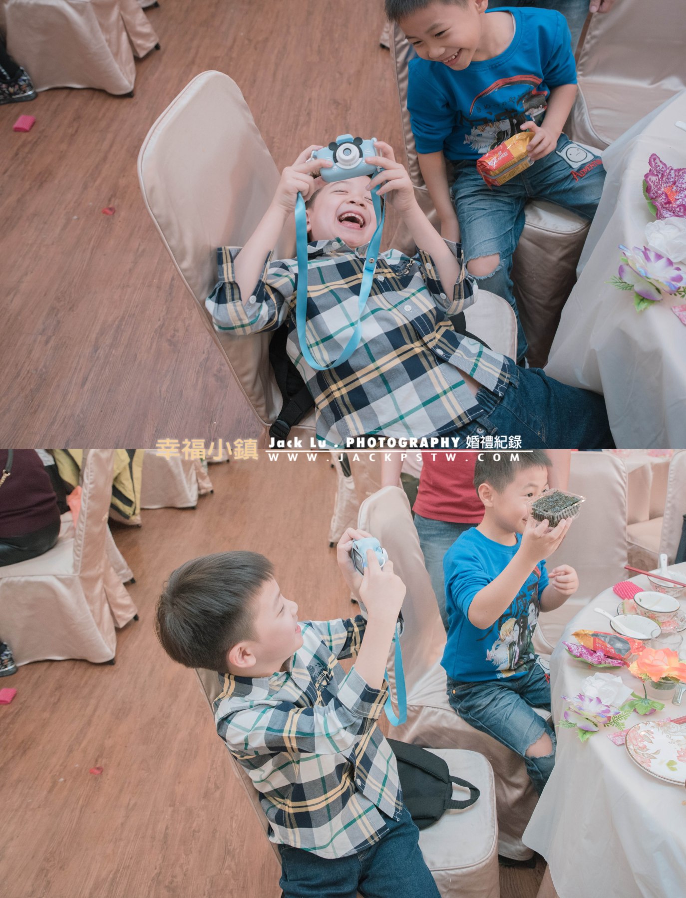喜愛拍照的賓客小朋友,當新人進行逐桌敬酒時,走到這桌時發現小朋友也拿相機在拍攝新郎新娘的畫面,讓我感覺很有趣,我偷偷拍幾張,被他們發現我在拍攝他們,小朋友變得不好意思,最後小朋友與我互拍一起來。話說這些特製給小朋友相機,有些還不便宜,之前在家樂福看到一台超過1000元。