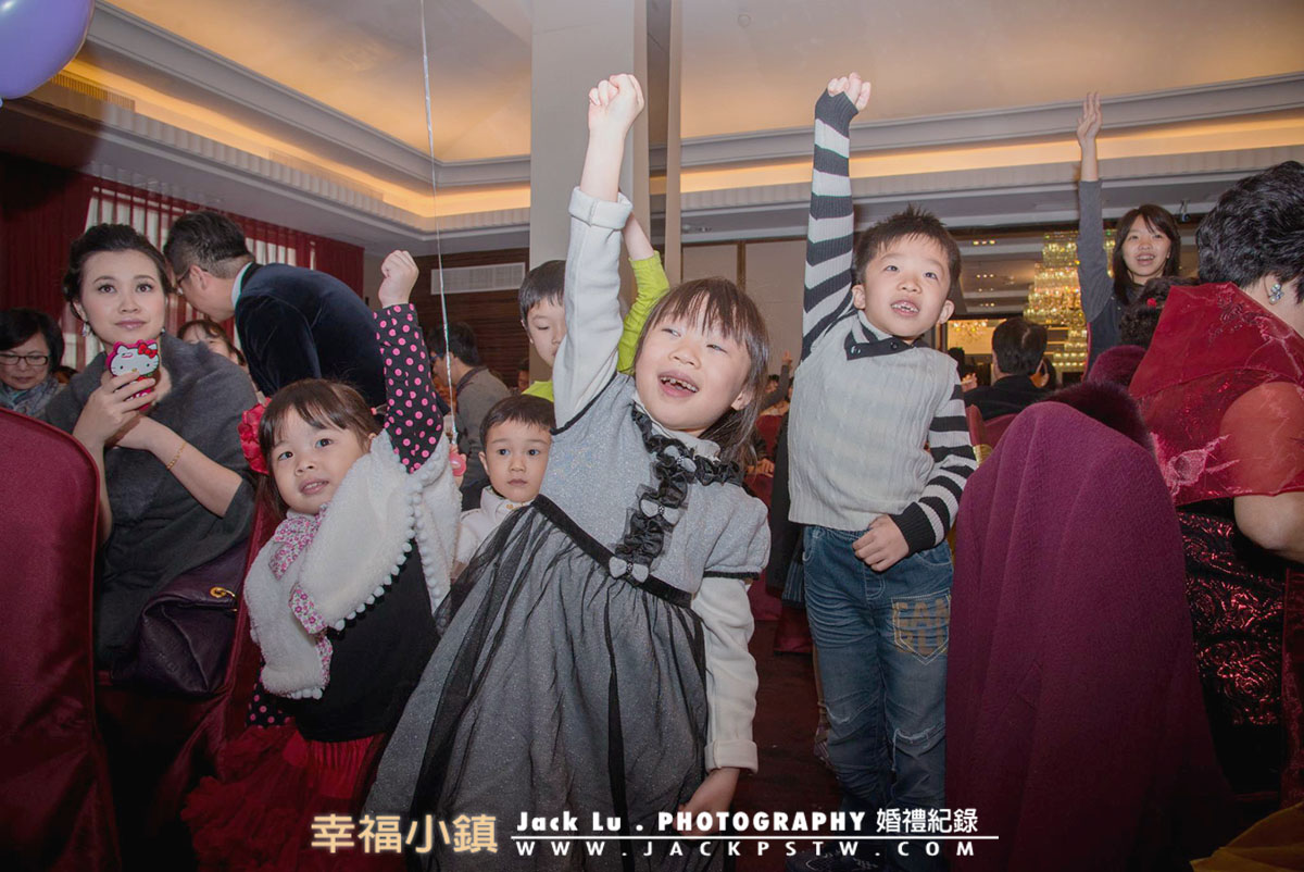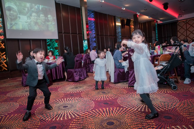 這次新娘子之前是幼稚園的老師,特別邀請之前學生前來,喜宴進行到後半段,大家都吃飽差不多,小朋友們就開始玩耍,有幾位就在走道上跳起舞來,相當的有趣被我注意到。