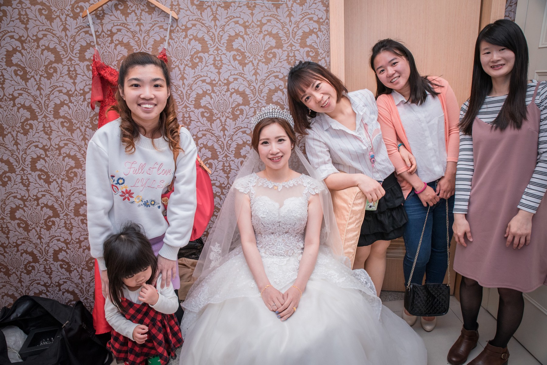 新娘朋友前來休息室看新娘,我幫大家拍張合照,小妹妹很害羞得不敢看的我,可能發現太多陌生人,變得害羞起來,我也不勉強他,就這樣默默拍下這樣合照,看的她手指還放在嘴巴旁邊,顯得相當可愛又有趣。