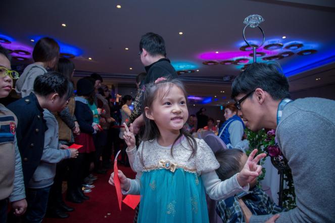新娘進場時,小朋友看到現場燈光打在白紗,露出開心的表情