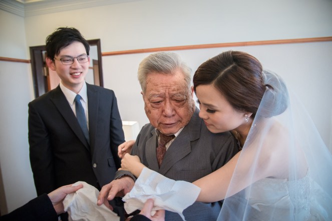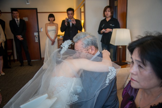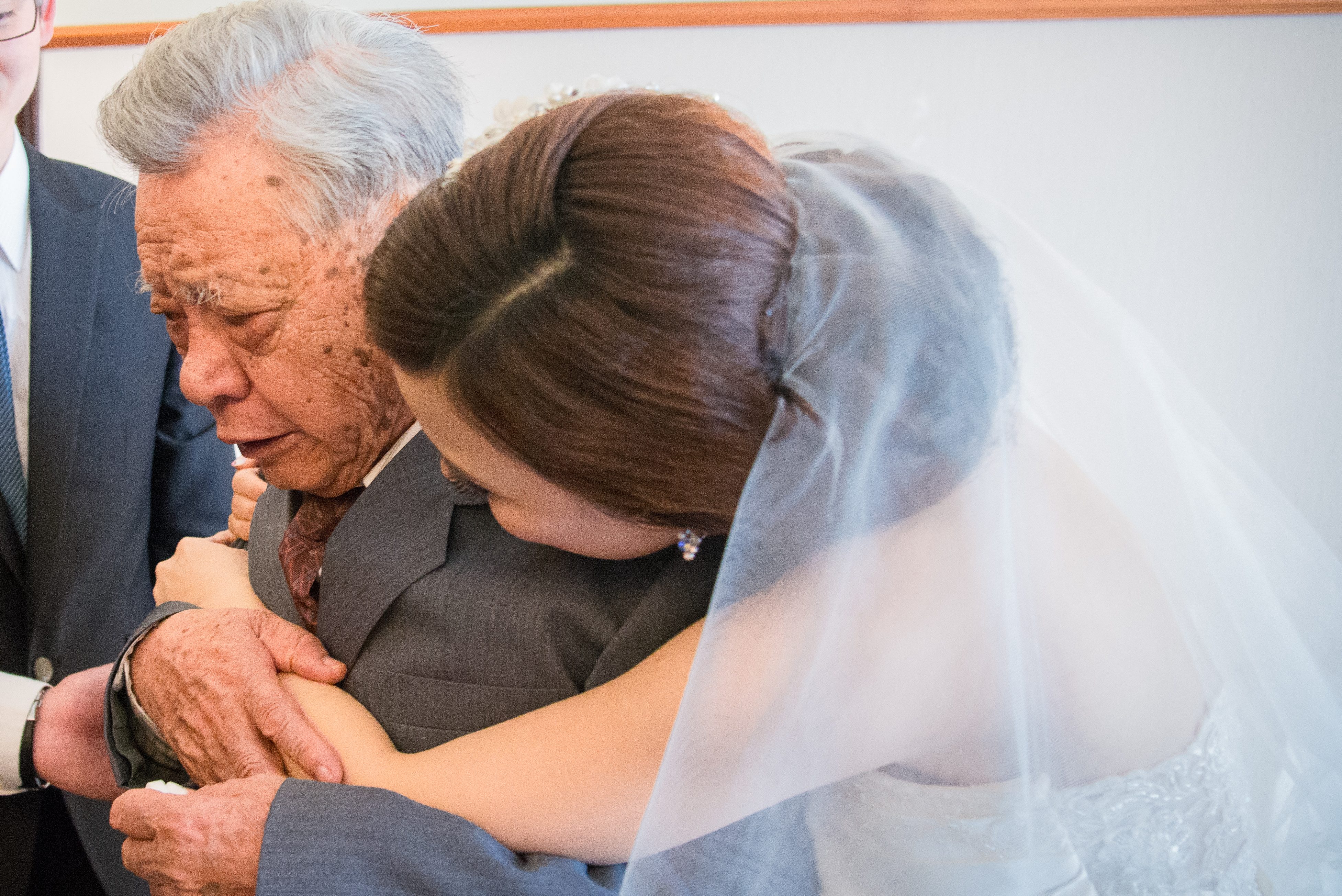 這場是在華王飯店的結婚儀式,前幾年結束營業的華王,現在已變成整塊平地,稍早新郎進行遊戲闖關,新娘的父親看的津津有味,相當的開心,還有說有笑一起同樂,當我整理好場地讓新娘有個比較好跪空間,我就注意到新娘臉上表情和她目光一直看下爸爸,父親則是低著頭,不言一,當新娘跪下的那時刻,父親臉就變,當時我也看到新娘姐妹的淚光,訂婚時父親都沒這激動,拜別結束後,眾人起身,父親站起來後就開始掉起眼淚,新娘看到衝過去,就從後面大大抱住父親,新娘說"你是我最愛的父親“,當我看這畫面,想到新娘小時候跟父親兩人時光,就像電影跑馬燈一個一個畫面浮現。