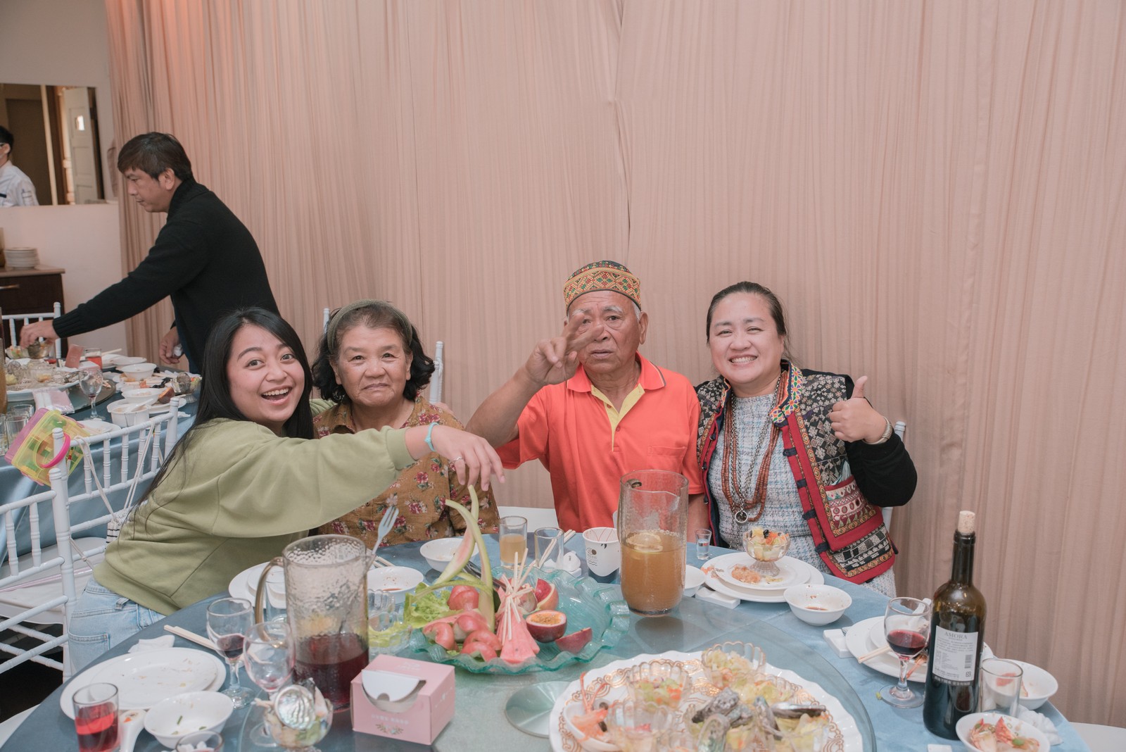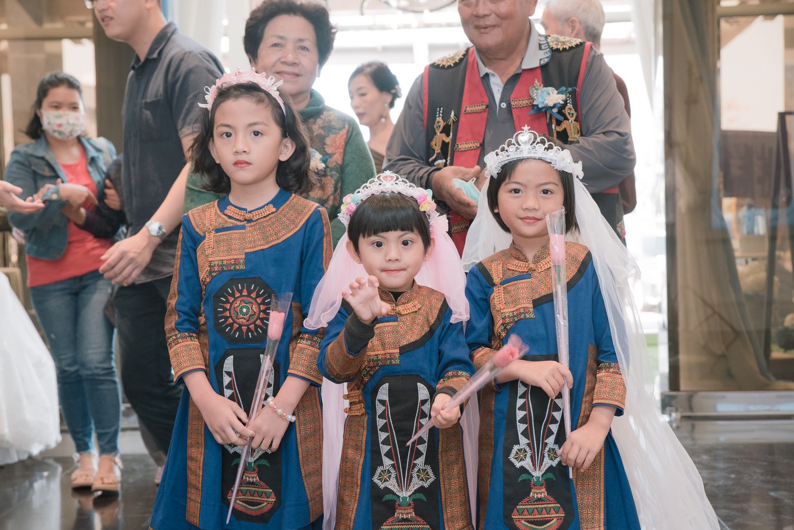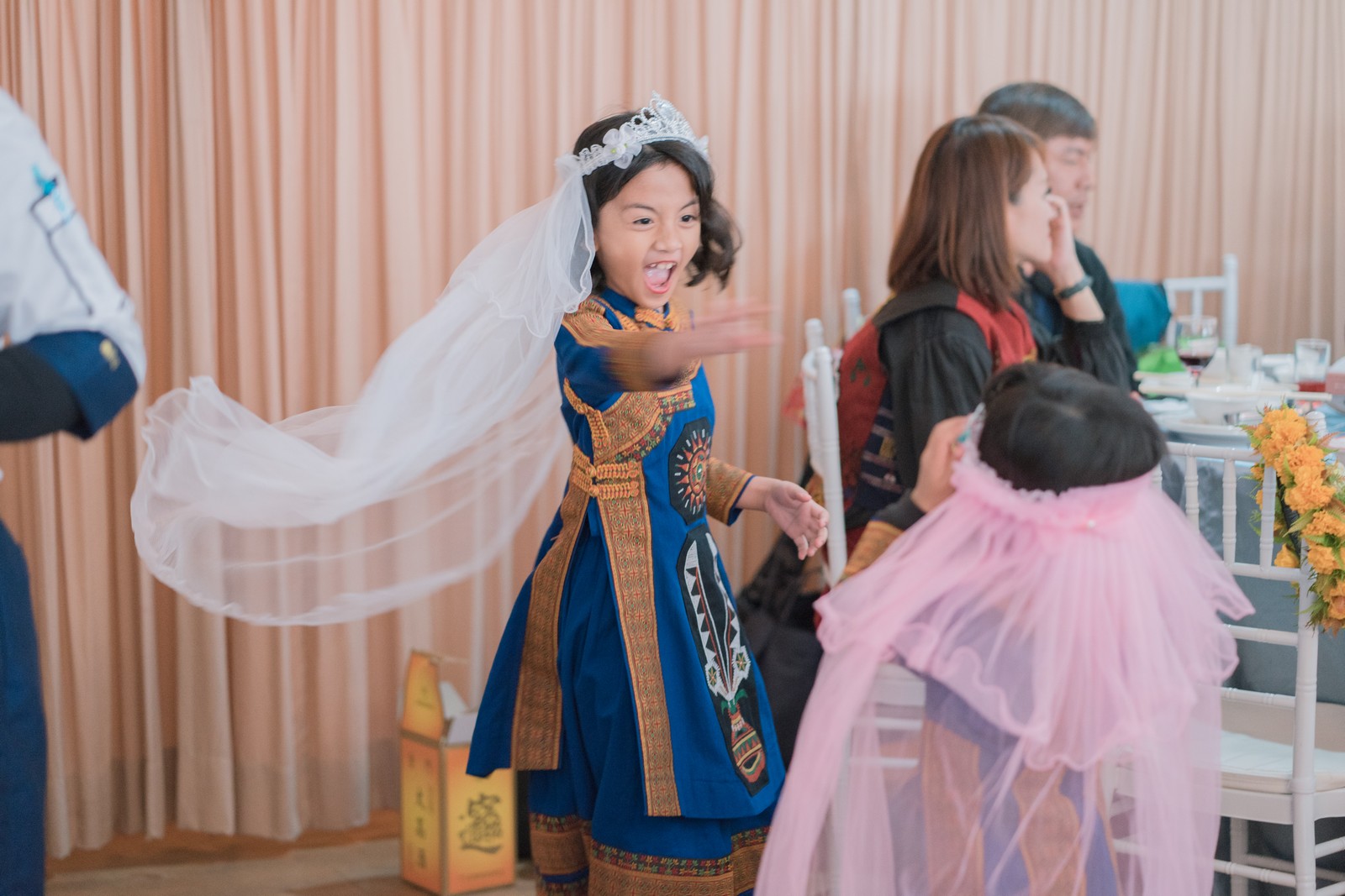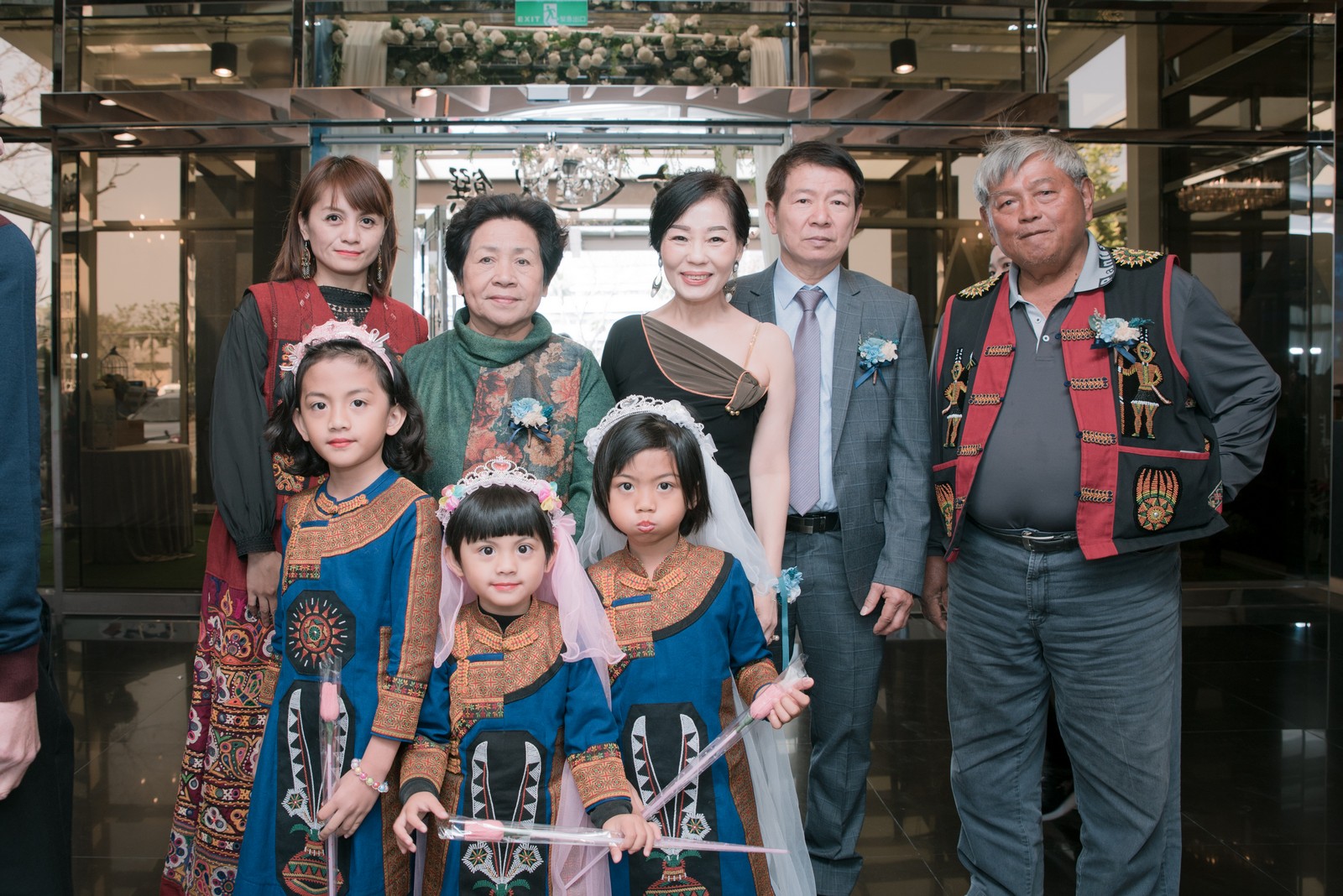 當時跟這場新娘溝通時,希望都可多拍攝在家人親友的部分,這場會以媽媽家人為重點的喜宴,雖然這樣但是我在拍攝上還是會留部分時間給新人拍攝部分,新郎倌他們家是原住民家族,當天小花童特別準備它們原住民當地衣服,這次主婚人也是相當好客,每位認識的朋友都要來張合照,每張都笑得很開心,難得大家都聚在一起吃飯,新娘媽媽是位很好客的人。