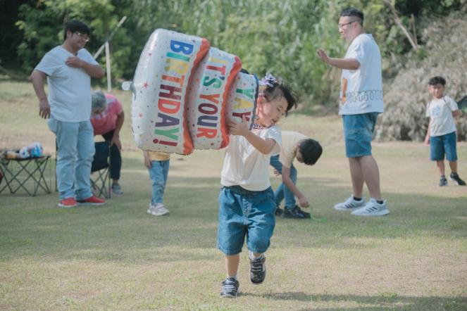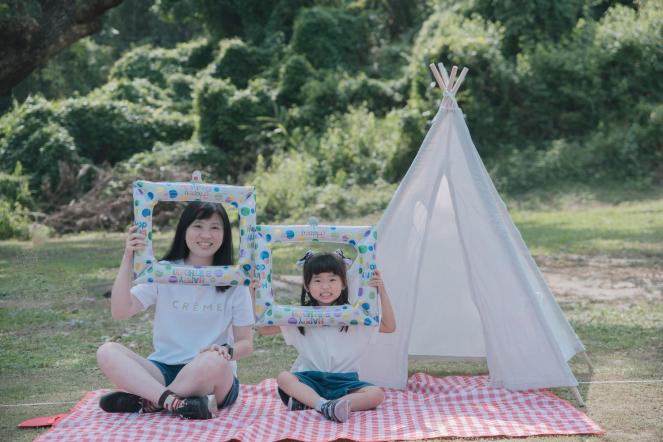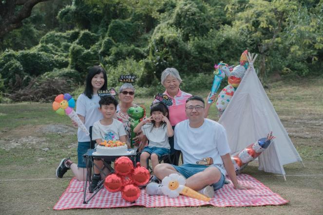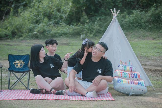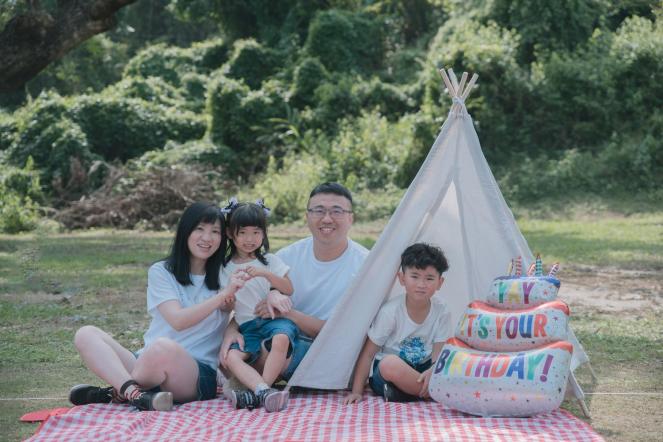 今年主題是走露營路線,幾個月前跟家長討論,爸媽特別買了一些露營的道具,打造出來野餐感覺,今年他們邀請冠霆好朋友一起來前來參加活動,這次變得2個家庭一起拍照片,顯得相當熱鬧,